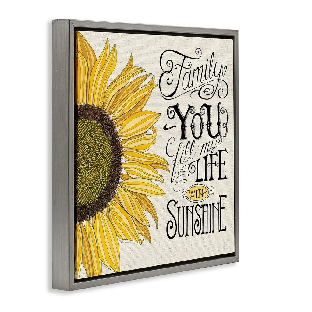 Elevate your home or office to the next level with Stupell Framed Floating Canvas Wall Art. Our premium hand-stretched canvas is mounted securely into a sturdy lightweight frame. The museum-style gap between the wrapped canvas and the box frame gives the illusion of floating artwork. Stupell Wall Art is made in the USA.Features: Dimensions: 18 x 1.7 x 18 Frame, 17 x 1.5 x 17 Canvas ArtFloating Frame Canvas Products are available in sizes 18"x18" and 25"x25". All Floating Frame Canvas Products have a 1.7" Depth.Wall Art is Ready to Hang with Hardware Free Hanging. No Installation required. For Easy Set Up Lean or Layer Artwork on Shelf or Against Wall. Artwork is Permently Fixed into the Frame.Our elevated 1.7" Thick Floating Frame is the perfect complement to our canvas style Wall Art. We use only the highest quality inks in house with industry leading printing solutions. Canvas is hand stretched over a durable wood foundation and then mounted securly into a Modern Box Frame. Made in the USA.Artwork Relates To: Phrase, Family, Flower, Floral, Sunflower, Vintage, Love, CountryDesign by Deb Strain