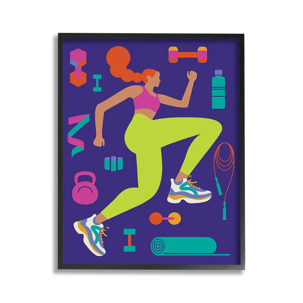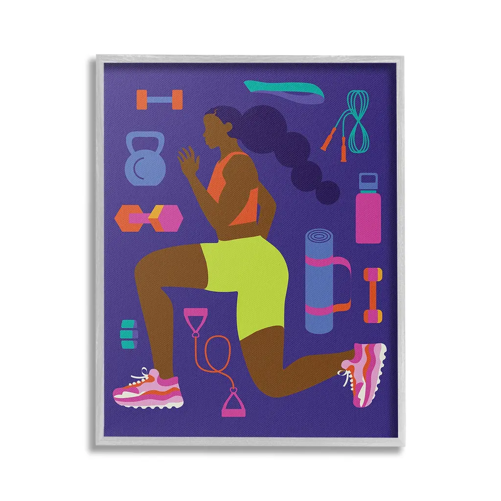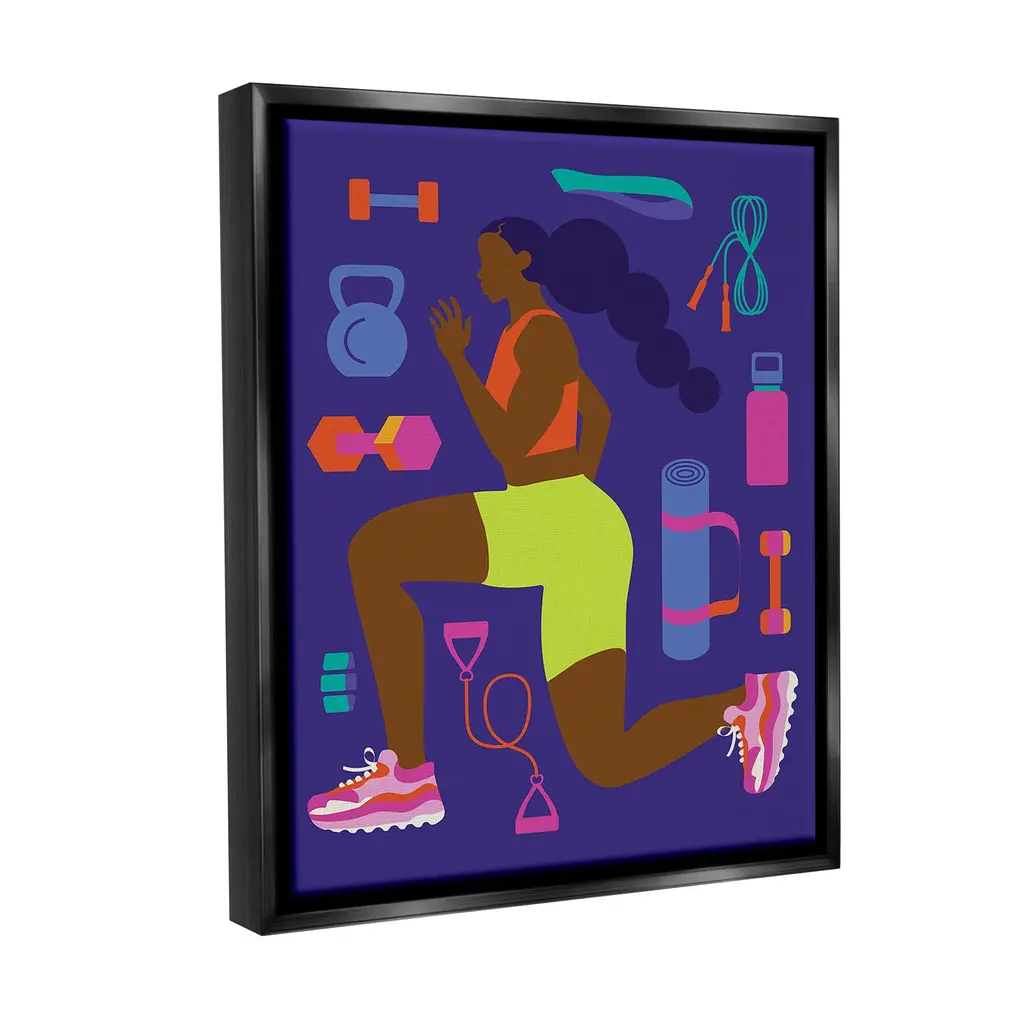 Elevate your home or office to the next level with Stupell Framed Floating Canvas Wall Art. Our premium hand-stretched canvas is mounted securely into a sturdy lightweight frame. The museum-style gap between the wrapped canvas and the box frame gives the illusion of floating artwork. Stupell Wall Art is made in the USA.Features: Dimensions: 17 x 1.7 x 21 Frame, 16 x 1.5 x 20 Canvas ArtFloating Frame Canvas Products are available in sizes 17"x21" and 25"x31". All Floating Frame Canvas Products have a 1.7" Depth.Wall Art is Ready to Hang with Hardware Free Hanging. No Installation required. For Easy Set Up Lean or Layer Artwork on Shelf or Against Wall. Artwork is Permently Fixed into the Frame.Our elevated 1.7" Thick Floating Frame is the perfect complement to our canvas style Wall Art. We use only the highest quality inks in house with industry leading printing solutions. Canvas is hand stretched over a durable wood foundation and then mounted securly into a Modern Box Frame. Made in the USA.Artwork Relates To: Person, Exercise, Workout, Woman, Modern, Weights, PatternDesign by Victoria Barnes