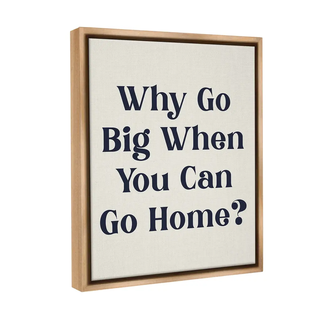 Elevate your home or office to the next level with Stupell Framed Floating Canvas Wall Art. Our premium hand-stretched canvas is mounted securely into a sturdy lightweight frame. The museum-style gap between the wrapped canvas and the box frame gives the illusion of floating artwork. Stupell Wall Art is made in the USA.Features: Dimensions: 17 x 1.7 x 21 Frame, 16 x 1.5 x 20 Canvas ArtFloating Frame Canvas Products are available in sizes 17"x21" and 25"x31". All Floating Frame Canvas Products have a 1.7" Depth.Wall Art is Ready to Hang with Hardware Free Hanging. No Installation required. For Easy Set Up Lean or Layer Artwork on Shelf or Against Wall. Artwork is Permently Fixed into the Frame.Our elevated 1.7" Thick Floating Frame is the perfect complement to our canvas style Wall Art. We use only the highest quality inks in house with industry leading printing solutions. Canvas is hand stretched over a durable wood foundation and then mounted securly into a Modern Box Frame. Made in the USA.Artwork Relates To: Phrase, Minimal, Introvert, Traditional, Humor, Why Go Big When You Can Go Home?Design by Lil' Rue
