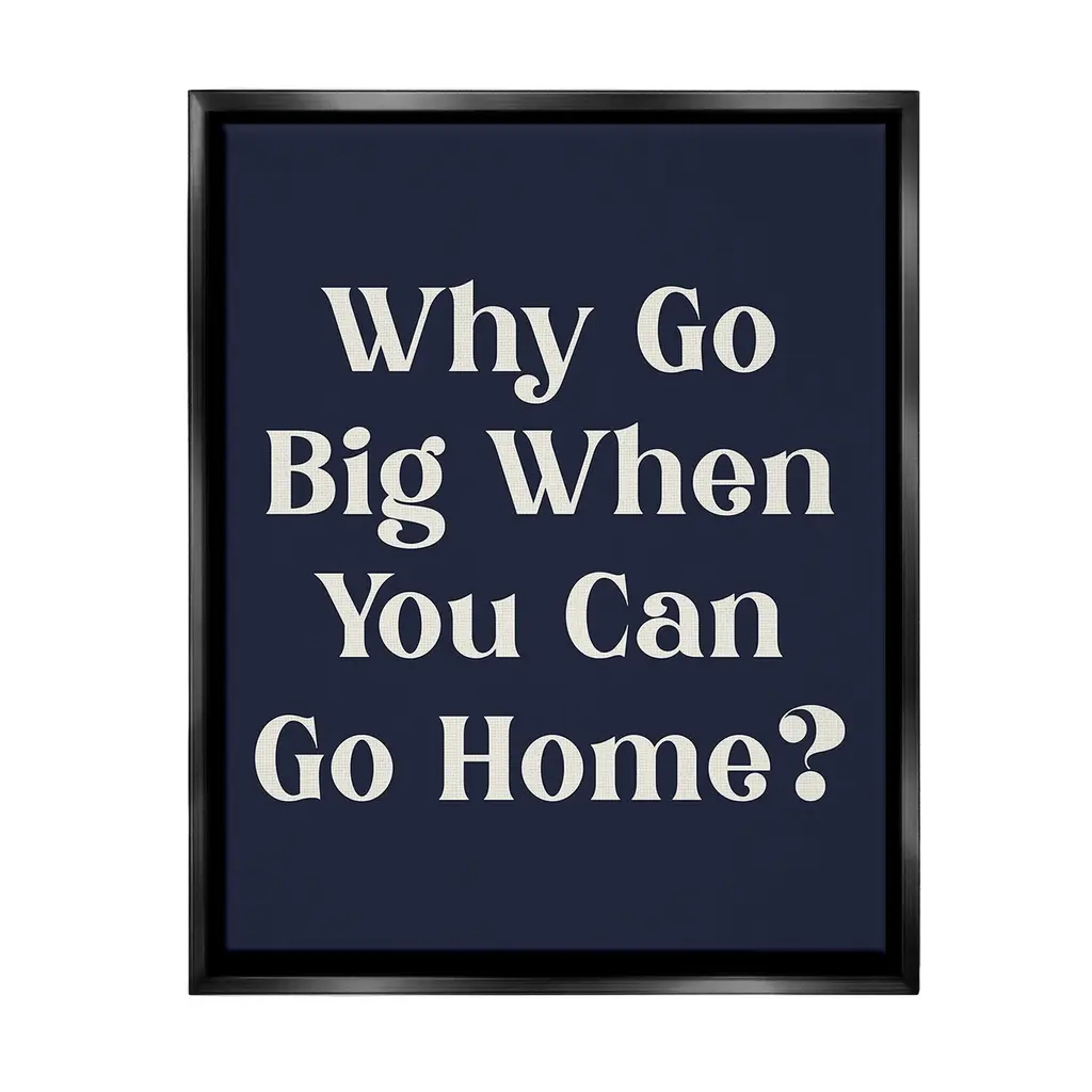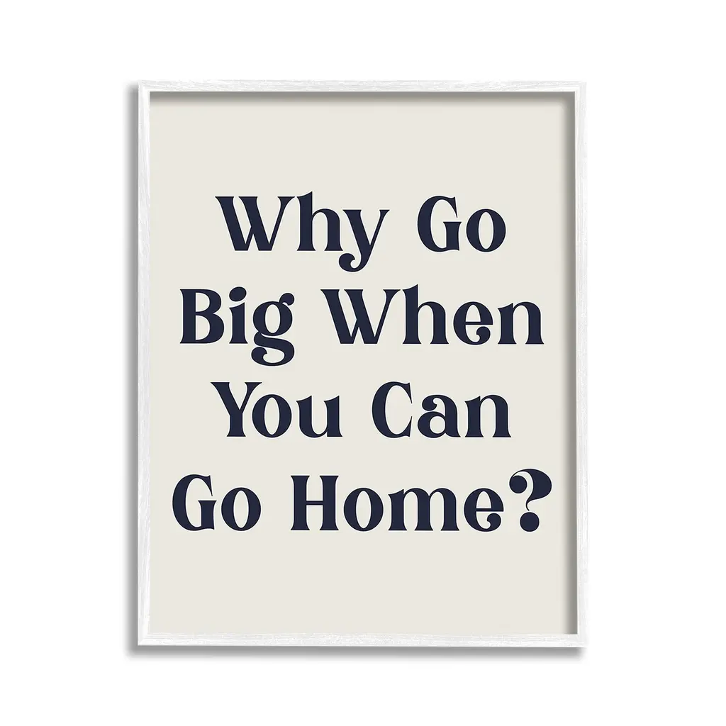 Add dimension to any room with our textured Framed Giclee Artwork. Our framed artwork is securely mounted into a 1.5-inch thick wood grain frame and ready to hang. Frames are available in three alluring styles: black, gray farmhouse and white. In addition, you should check out our oversized options if you want a statement piece. Stupell Wall Art is made in the USA.Features: Dimensions: 11 x 1.5 x 14 FramedFramed Giclee Products are available in the sizes 11"x14", 16"x20" or 24"x30". All Framed Giclee Products have a 1.5" Depth. Wall Art is Ready to Hang with Hardware Free Hanging. No installation required. For Easy Set Up Lean or Layer Artwork on Shelf or Against Wall.Our giclée prints are carefully mounted on a durable MDF backing, and then perfectly finished in a 1.5 inch thick woodgrain frame. Mounted frame colors include black, gray farmhouse and white. Made In USA.Artwork Relates To: Phrase, Minimal, Introvert, Traditional, Humor, Why Go Big When You Can Go Home?Design by Lil' Rue