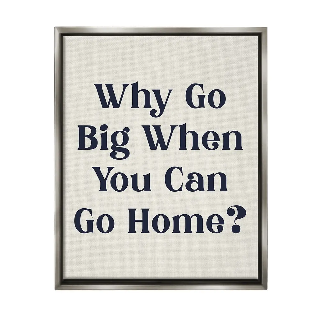 Add dimension to any room with our textured Framed Giclee Artwork. Our framed artwork is securely mounted into a 1.5-inch thick wood grain frame and ready to hang. Frames are available in three alluring styles: black, gray farmhouse and white. In addition, you should check out our oversized options if you want a statement piece. Stupell Wall Art is made in the USA.Features: Dimensions: 11 x 1.5 x 14 FramedFramed Giclee Products are available in the sizes 11"x14", 16"x20" or 24"x30". All Framed Giclee Products have a 1.5" Depth. Wall Art is Ready to Hang with Hardware Free Hanging. No installation required. For Easy Set Up Lean or Layer Artwork on Shelf or Against Wall.Our giclée prints are carefully mounted on a durable MDF backing, and then perfectly finished in a 1.5 inch thick woodgrain frame. Mounted frame colors include black, gray farmhouse and white. Made In USA.Artwork Relates To: Phrase, Minimal, Introvert, Traditional, Humor, Why Go Big When You Can Go Home?Design by Lil' Rue
