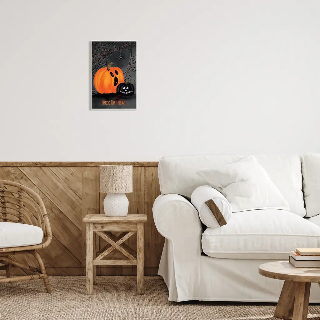 Our wall plaques start as high-quality lithograph prints mounted on durable 0.5-inch thick MDF wood. Each piece is hand finished and comes with a fresh layer of white foil on the sides to give it a crisp, clean look. Plaques arrive ready to hang without installation and come with removable plastic corners to keep them from damage in transit. Stupell Wall Art is made in the USA.Features: Dimensions: 10 x 0.5 x 15 InchesWall Plaque Sizes Include Standard: 10 x 0.5 x 15 Oversized: 13 x 0.5 x 19Wall Art is Ready to Hang with Hardware Free Hanging. No installation required. For Easy Set Up Lean or Layer Artwork on Shelf or Against Wall.All of our wall plaques start off as high quality lithograph prints that are then mounted on durable 0.5 inch thick MDF wood. Each piece is hand finished and comes with a fresh layer of foil on the sides to give it a crisp clean look. Made In USA.Artwork Relates To: Plant, Produce, Pumpkin, Festival, Halloween, Spider, Web, Jack-o-Lantern, Trick or TreatDesign by Amy Hall