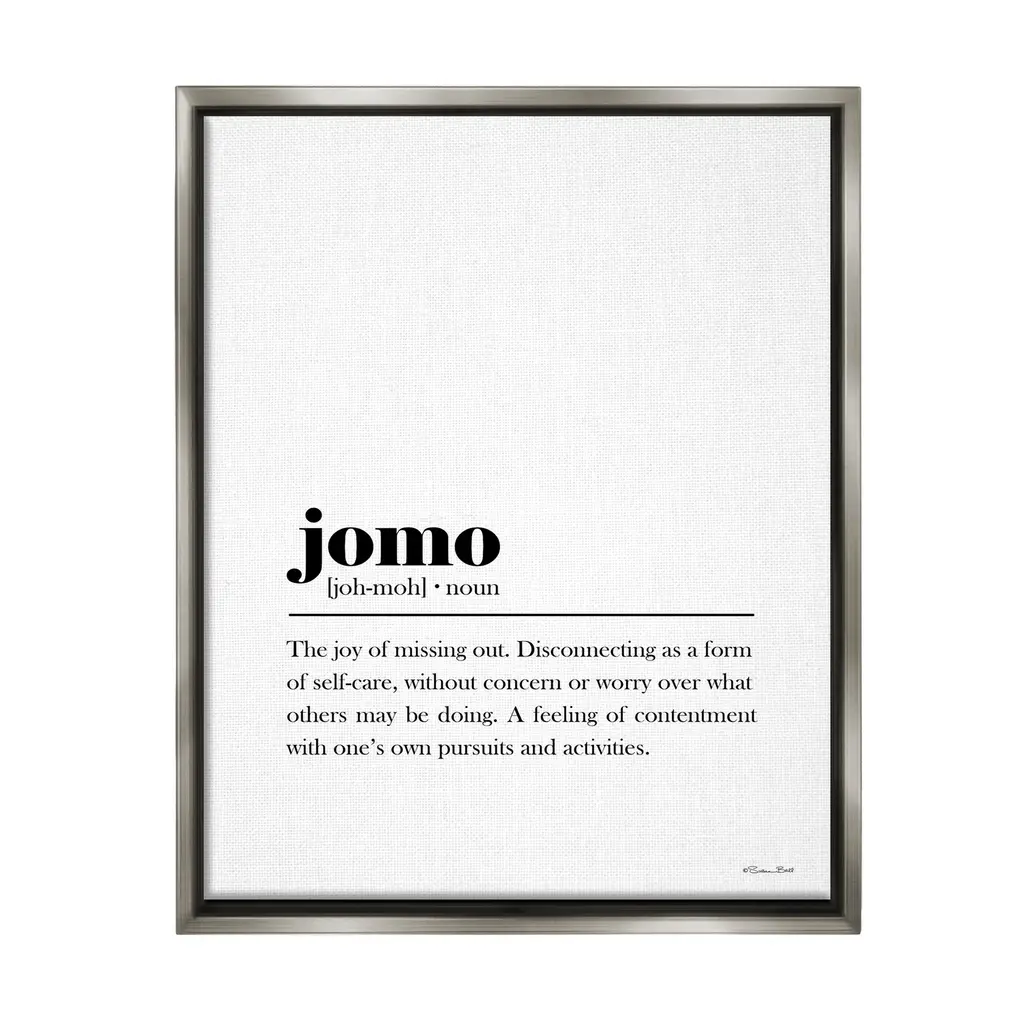 Elevate your home or office to the next level with Stupell Framed Floating Canvas Wall Art. Our premium hand-stretched canvas is mounted securely into a sturdy lightweight frame. The museum-style gap between the wrapped canvas and the box frame gives the illusion of floating artwork. Stupell Wall Art is made in the USA.Features: Dimensions: 17 x 1.7 x 21 Frame, 16 x 1.5 x 20 Canvas ArtFloating Frame Canvas Products are available in sizes 17"x21" and 25"x31". All Floating Frame Canvas Products have a 1.7" Depth.Wall Art is Ready to Hang with Hardware Free Hanging. No Installation required. For Easy Set Up Lean or Layer Artwork on Shelf or Against Wall. Artwork is Permently Fixed into the Frame.Our elevated 1.7" Thick Floating Frame is the perfect complement to our canvas style Wall Art. We use only the highest quality inks in house with industry leading printing solutions. Canvas is hand stretched over a durable wood foundation and then mounted securly into a Modern Box Frame. Made in the USA.Artwork Relates To: Bathroom, Funny, Humor, Definition, The joy of missing out. Disconnecting as a form of self-care without concern or worry over what others may be doing. A feeling of contentment with one's own pursuits and activitiesDesign by Susan Ball