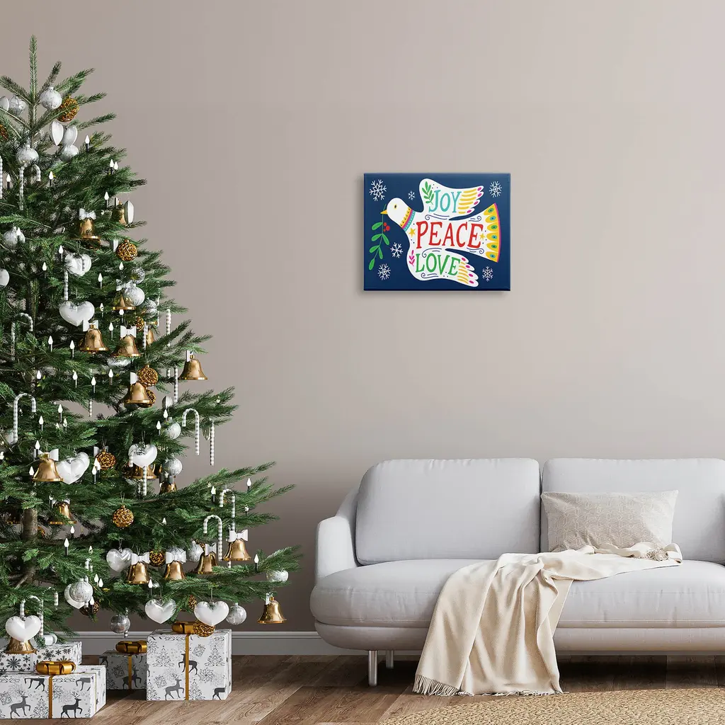 Proudly made in the USA, Our stretched canvas is created with the highest standards. We use only the highest quality inks and canvas on our in house Mimaki printers, and then hand cut and stretch each piece over a 1.5 inch thick wooden frame for hanging. The art comes ready to hang with no installation required.Features: Dimensions: 20 x 1.5 x 16 InchesStretched Canvas Sizes Include Standard: 20 x 1.5 x 16 Large: 30 x 1.5 x 20 X-Large: 40 x 1.5 x 30 Oversized: 48 x 1.5 x 36Wall Art is Ready to Hang - No Installation or Hardware Needed. For Easy Set Up Lean or Layer Artwork on Shelf or Against Wall.Our stretched canvas is created with the highest standards. We use only the highest quality inks and canvas on our in house Mimaki printers, and then hand cut and stretch each piece over a 1.5 inch thick wooden frame for hanging. Made In USA.Artwork Relates To: Dove, Animal, Bird, Seasonal, Holiday, Winter, SnowflakeDesign by Nina SevenLiving Room, Den, Hallway, Office, Entryway, Study, Dining Room or Bed Room.Text Includes: Joy Peace Love