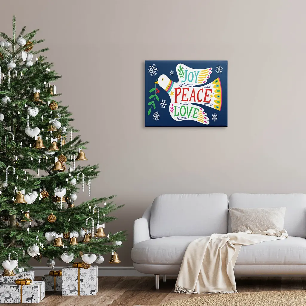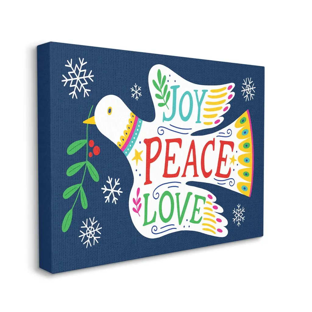 Proudly made in the USA, Our stretched canvas is created with the highest standards. We use only the highest quality inks and canvas on our in house Mimaki printers, and then hand cut and stretch each piece over a 1.5 inch thick wooden frame for hanging. The art comes ready to hang with no installation required.Features: Dimensions: 20 x 1.5 x 16 InchesStretched Canvas Sizes Include Standard: 20 x 1.5 x 16 Large: 30 x 1.5 x 20 X-Large: 40 x 1.5 x 30 Oversized: 48 x 1.5 x 36Wall Art is Ready to Hang - No Installation or Hardware Needed. For Easy Set Up Lean or Layer Artwork on Shelf or Against Wall.Our stretched canvas is created with the highest standards. We use only the highest quality inks and canvas on our in house Mimaki printers, and then hand cut and stretch each piece over a 1.5 inch thick wooden frame for hanging. Made In USA.Artwork Relates To: Dove, Animal, Bird, Seasonal, Holiday, Winter, SnowflakeDesign by Nina SevenLiving Room, Den, Hallway, Office, Entryway, Study, Dining Room or Bed Room.Text Includes: Joy Peace Love