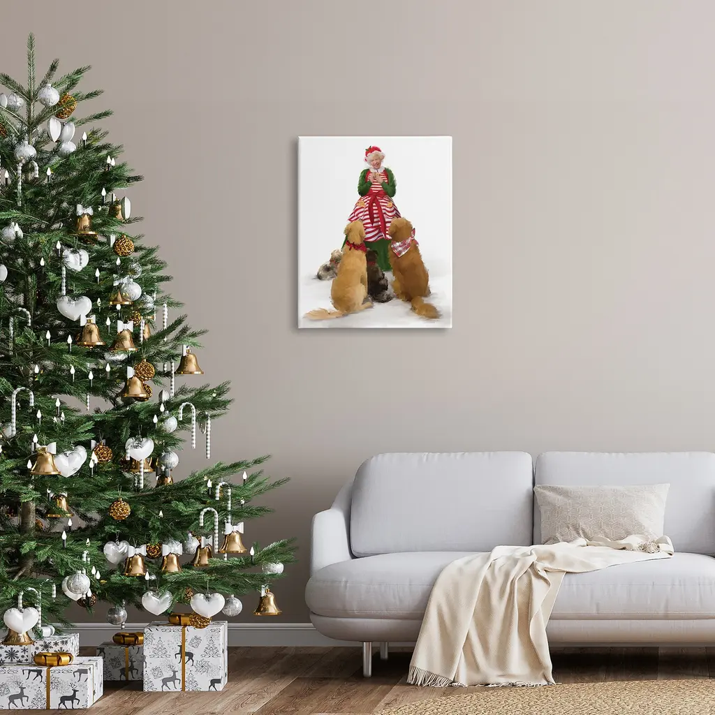 Stupell Joyful Mrs. Claus & Dogs Holiday Christmas Illustration Canvas Wall Art - Green - 24 X 30