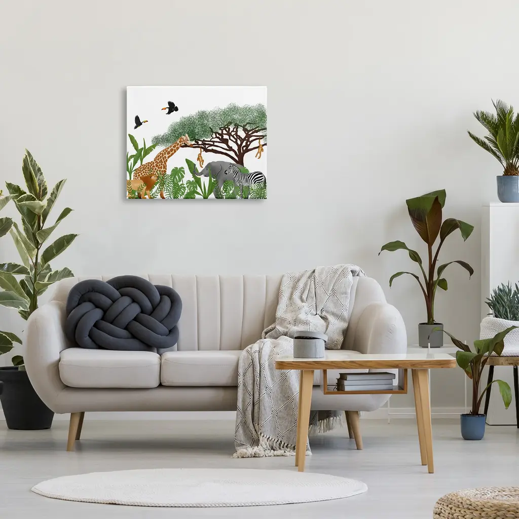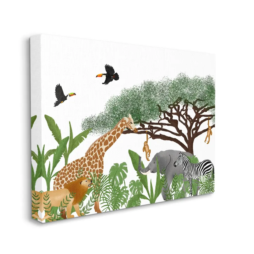 We create our stretched canvas to the highest standards. Using only the highest quality inks and canvas on Mimaki printers, we hand-cut and stretch each piece over a 1.5-inch thick wooden frame for hanging. As a result, the art comes ready to hang on the sturdy ledge with no installation required. Stupell Wall Art is made in the USA.Features: Dimensions: 20 x 1.5 x 16 InchesStretched Canvas Sizes Include Standard: 20 x 1.5 x 16 Large: 30 x 1.5 x 20 X-Large: 40 x 1.5 x 30 Oversized: 48 x 1.5 x 36Wall Art is Ready to Hang - No Installation or Hardware Needed. For Easy Set Up Lean or Layer Artwork on Shelf or Against Wall.Our stretched canvas is created with the highest standards. We use only the highest quality inks and canvas on our in house Mimaki printers, and then hand cut and stretch each piece over a 1.5 inch thick wooden frame for hanging. Made In USA.Artwork Relates To: Animal, Mammal, Wildlife, Zebra, Plant, Jungle, Nature, Bird, Rainforest, Tree, Giraffe, ToucanDesign by Ale Saiz Studio