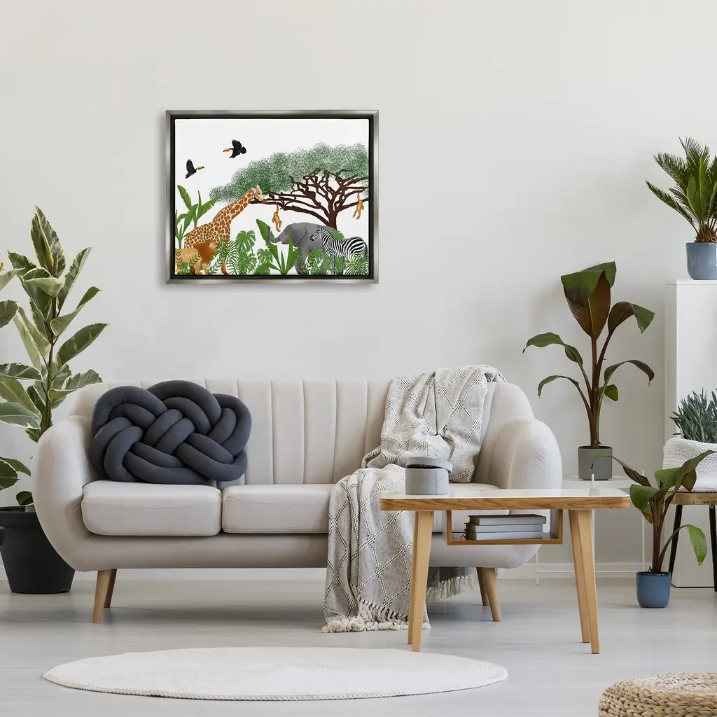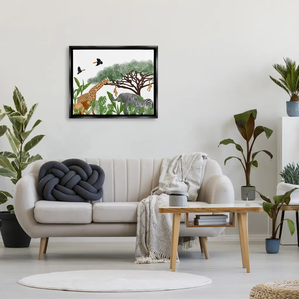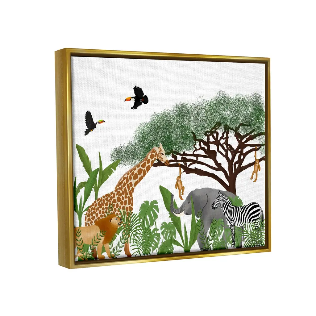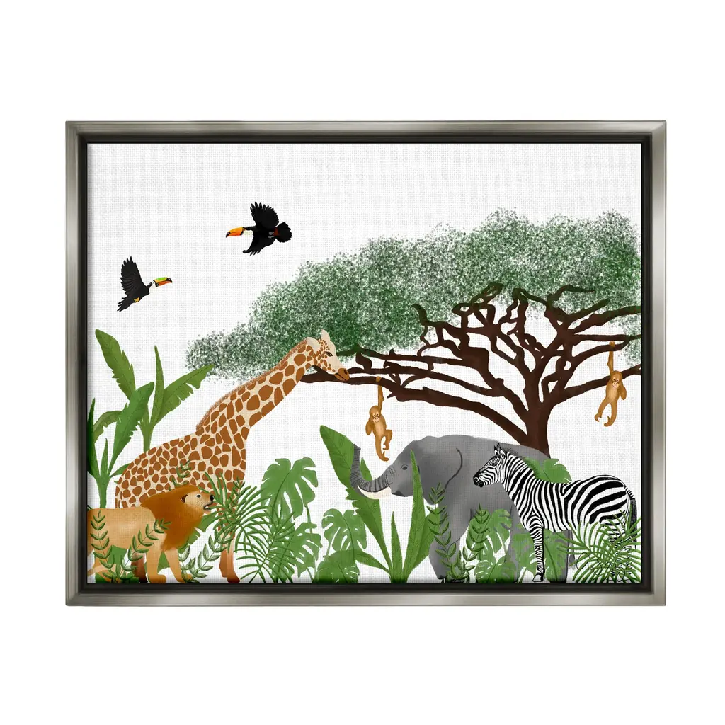 Elevate your home or office to the next level with Stupell Framed Floating Canvas Wall Art. Our premium hand-stretched canvas is mounted securely into a sturdy lightweight frame. The museum-style gap between the wrapped canvas and the box frame gives the illusion of floating artwork. Stupell Wall Art is made in the USA.Features: Dimensions: 21 x 1.7 x 17 Frame, 20 x 1.5 x 16 Canvas ArtFloating Frame Sizes Include Standard: 21 x 1.7 x 17 Oversized: 31 x 1.7 x 25Wall Art is Ready to Hang - No Installation or Hardware Needed. For Easy Set Up Lean or Layer Artwork on Shelf or Against Wall.Our elevated 1.7" Thick Floating Frame is the perfect complement to our canvas style Wall Art. We use only the highest quality inks in house with industry leading printing solutions. Canvas is hand stretched over a durable wood foundation and then mounted securly into a Modern Box Frame. Made in the USA.Artwork Relates To: Animal, Mammal, Wildlife, Zebra, Plant, Jungle, Nature, Bird, Rainforest, Tree, Giraffe, ToucanDesign by Ale Saiz Studio