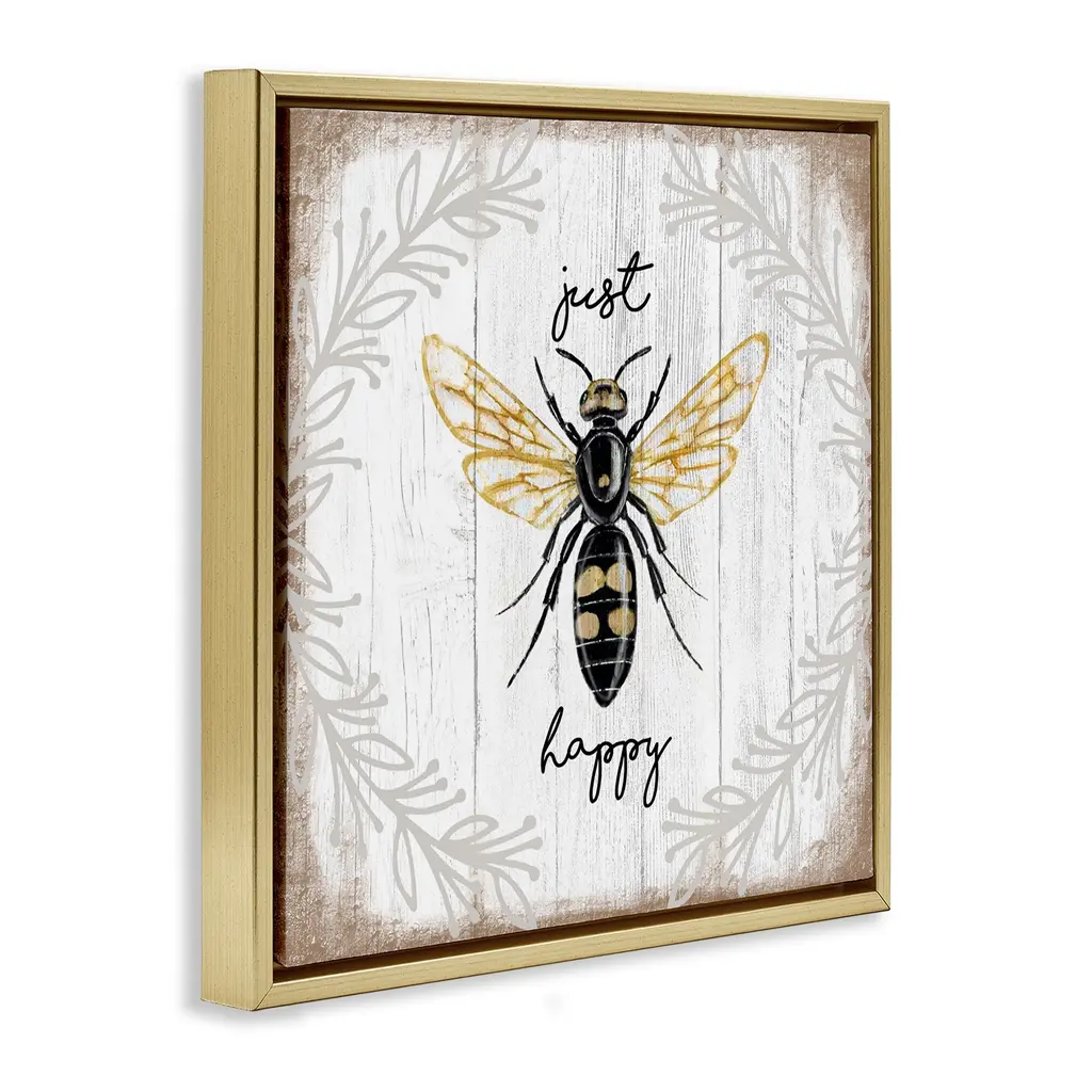 Stupell Just Be Happy Charming Bee Framed Floater Canvas Wall Art Design By Elizabeth Tyndall - 25 X 25 - Gold