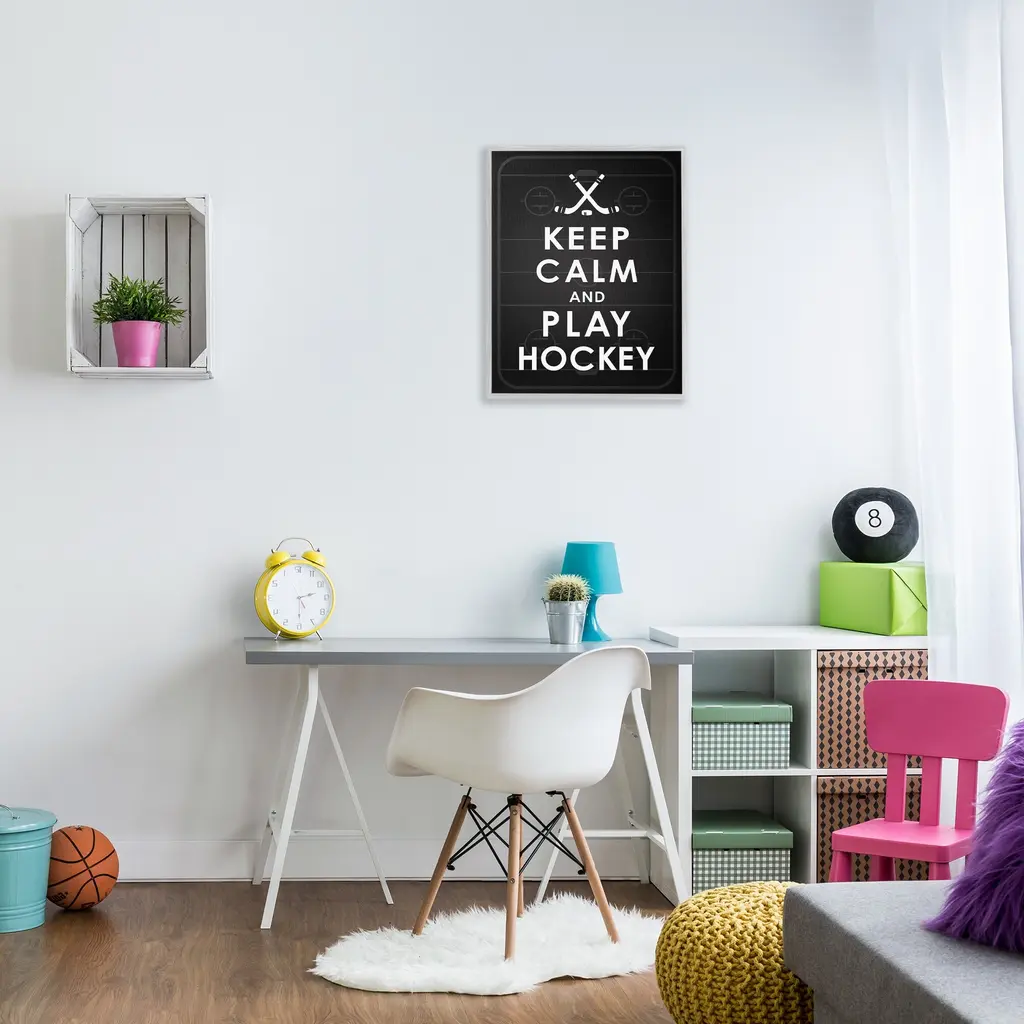 Add dimension to any room with our textured Framed Giclee Artwork. Our framed artwork is securely mounted into a 1.5-inch thick wood grain frame and ready to hang. Frames are available in three alluring styles: black, gray farmhouse and white. In addition, you should check out our oversized options if you want a statement piece. Stupell Wall Art is made in the USA.Features: Dimensions: 11 x 1.5 x 14 FramedFramed Giclee Products are available in the sizes 11"x14", 16"x20" or 24"x30". All Framed Giclee Products have a 1.5" Depth. Wall Art is Ready to Hang with Hardware Free Hanging. No installation required. For Easy Set Up Lean or Layer Artwork on Shelf or Against Wall.Our giclée prints are carefully mounted on a durable MDF backing, and then perfectly finished in a 1.5 inch thick woodgrain frame. Mounted frame colors include black, gray farmhouse and white. Made In USA.Artwork Relates To: Hockey, Ice Hockey, Rink, Skating, Sport, Abstract, Vintage, Pattern, Hockey Stick, Puck, Keep Calm and Play HockeyDesign by Jace Grey