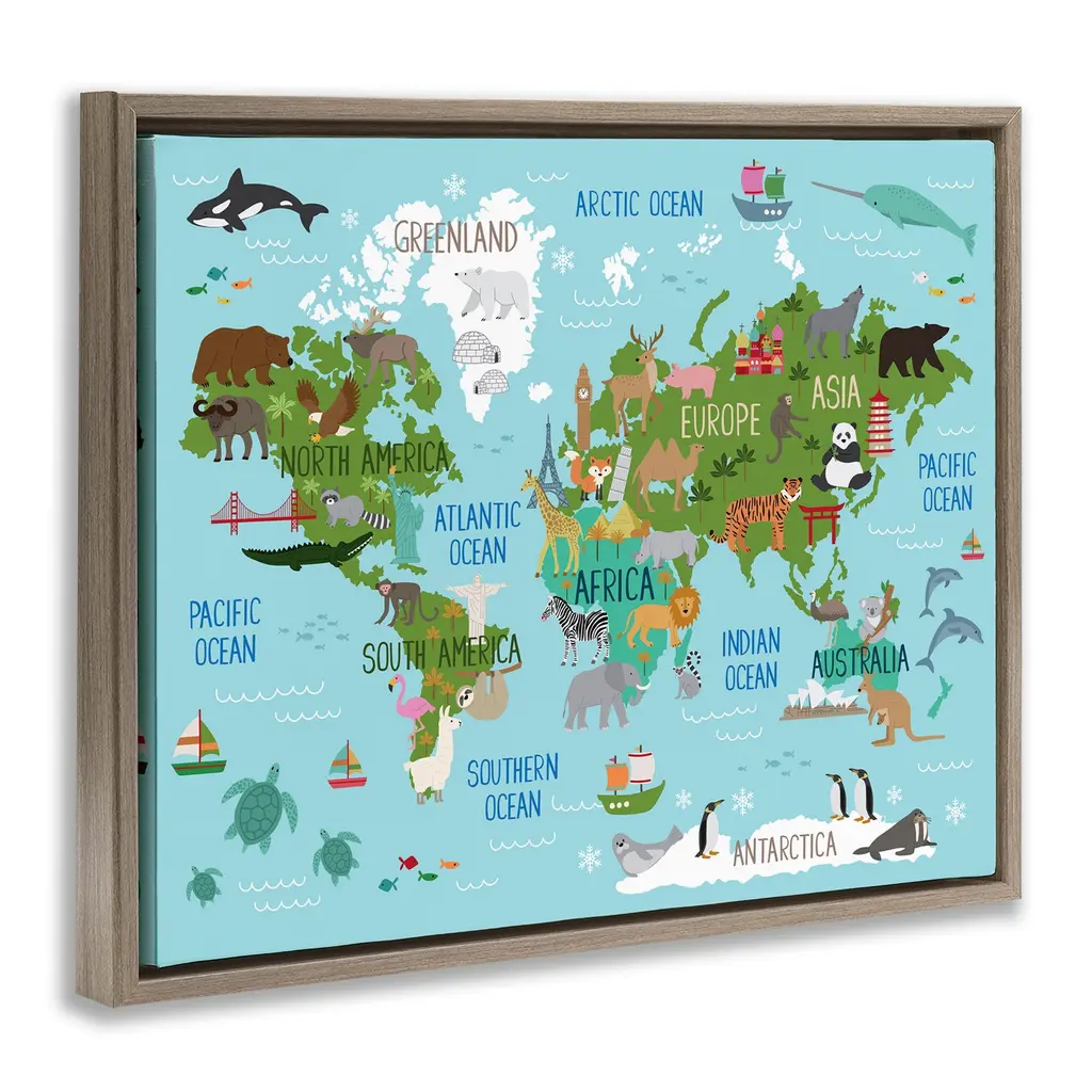 Elevate your home or office to the next level with Stupell Framed Floating Canvas Wall Art. Our premium hand-stretched canvas is mounted securely into a sturdy lightweight frame. The museum-style gap between the wrapped canvas and the box frame gives the illusion of floating artwork. Stupell Wall Art is made in the USA.Features: Dimensions: 21 x 1.7 x 17 Frame, 20 x 1.5 x 16 Canvas ArtFloating Frame Canvas Products are available in sizes 21"x17" and 31"x25". All Floating Frame Canvas Products have a 1.7" Depth.Wall Art is Ready to Hang with Hardware Free Hanging. No Installation required. For Easy Set Up Lean or Layer Artwork on Shelf or Against Wall. Artwork is Permently Fixed into the Frame.Our elevated 1.7" Thick Floating Frame is the perfect complement to our canvas style Wall Art. We use only the highest quality inks in house with industry leading printing solutions. Canvas is hand stretched over a durable wood foundation and then mounted securly into a Modern Box Frame. Made in the USA.Artwork Relates To: Map, World Map, Travel, Adventure, Animals, EducationalDesign by Lisa Whitebutton