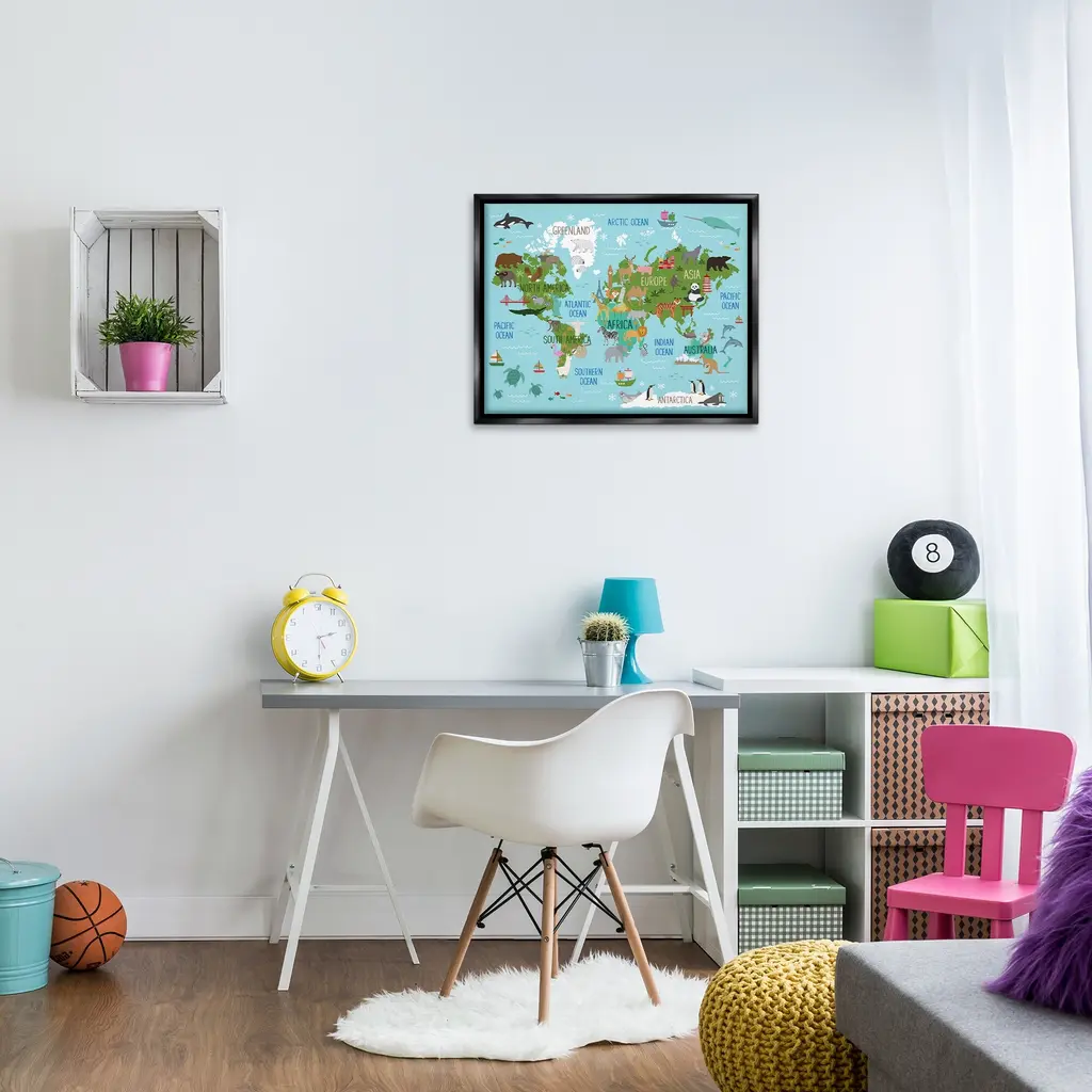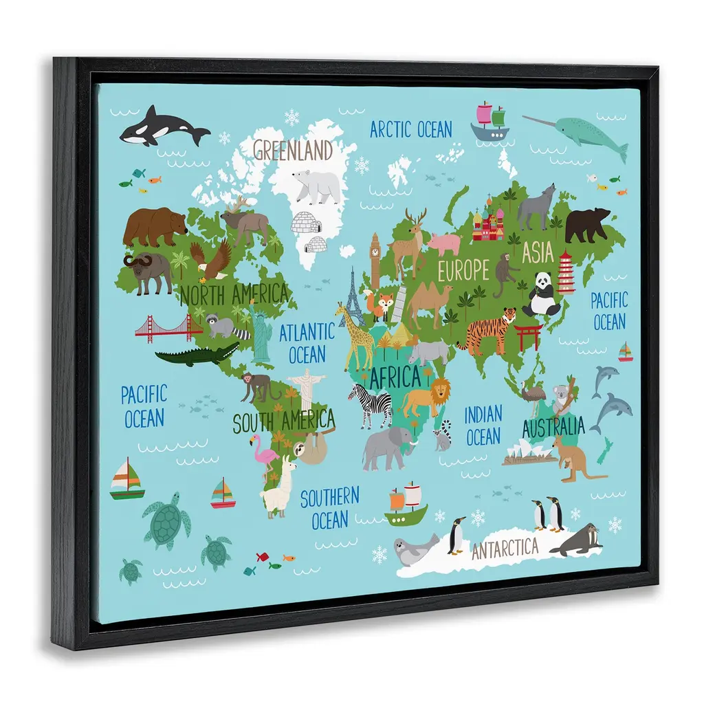 Elevate your home or office to the next level with Stupell Framed Floating Canvas Wall Art. Our premium hand-stretched canvas is mounted securely into a sturdy lightweight frame. The museum-style gap between the wrapped canvas and the box frame gives the illusion of floating artwork. Stupell Wall Art is made in the USA.Features: Dimensions: 21 x 1.7 x 17 Frame, 20 x 1.5 x 16 Canvas ArtFloating Frame Canvas Products are available in sizes 21"x17" and 31"x25". All Floating Frame Canvas Products have a 1.7" Depth.Wall Art is Ready to Hang with Hardware Free Hanging. No Installation required. For Easy Set Up Lean or Layer Artwork on Shelf or Against Wall. Artwork is Permently Fixed into the Frame.Our elevated 1.7" Thick Floating Frame is the perfect complement to our canvas style Wall Art. We use only the highest quality inks in house with industry leading printing solutions. Canvas is hand stretched over a durable wood foundation and then mounted securly into a Modern Box Frame. Made in the USA.Artwork Relates To: Map, World Map, Travel, Adventure, Animals, EducationalDesign by Lisa Whitebutton