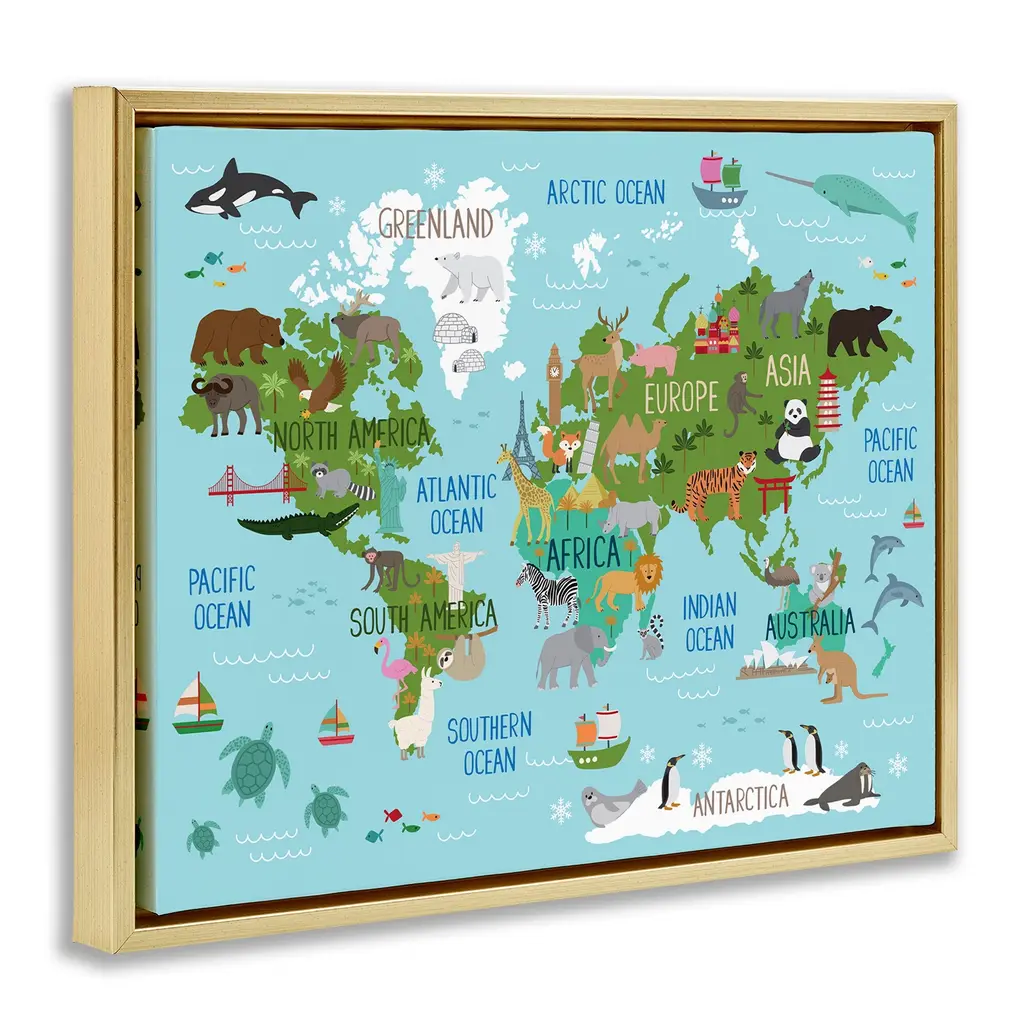 Elevate your home or office to the next level with Stupell Framed Floating Canvas Wall Art. Our premium hand-stretched canvas is mounted securely into a sturdy lightweight frame. The museum-style gap between the wrapped canvas and the box frame gives the illusion of floating artwork. Stupell Wall Art is made in the USA.Features: Dimensions: 21 x 1.7 x 17 Frame, 20 x 1.5 x 16 Canvas ArtFloating Frame Canvas Products are available in sizes 21"x17" and 31"x25". All Floating Frame Canvas Products have a 1.7" Depth.Wall Art is Ready to Hang with Hardware Free Hanging. No Installation required. For Easy Set Up Lean or Layer Artwork on Shelf or Against Wall. Artwork is Permently Fixed into the Frame.Our elevated 1.7" Thick Floating Frame is the perfect complement to our canvas style Wall Art. We use only the highest quality inks in house with industry leading printing solutions. Canvas is hand stretched over a durable wood foundation and then mounted securly into a Modern Box Frame. Made in the USA.Artwork Relates To: Map, World Map, Travel, Adventure, Animals, EducationalDesign by Lisa Whitebutton