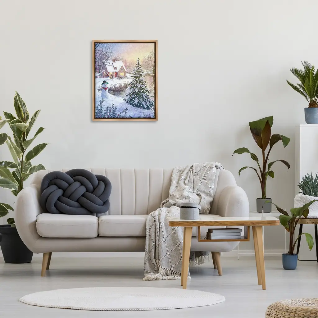 Elevate your home or office to the next level with Stupell Framed Floating Canvas Wall Art. Our premium hand-stretched canvas is mounted securely into a sturdy lightweight frame. The museum-style gap between the wrapped canvas and the box frame gives the illusion of floating artwork. Stupell Wall Art is made in the USA.Features: Dimensions: 17 x 1.7 x 21 Frame, 16 x 1.5 x 20 Canvas ArtFloating Frame Canvas Products are available in sizes 17"x21" and 25"x31". All Floating Frame Canvas Products have a 1.7" Depth.Wall Art is Ready to Hang with Hardware Free Hanging. No Installation required. For Easy Set Up Lean or Layer Artwork on Shelf or Against Wall. Artwork is Permently Fixed into the Frame.Our elevated 1.7" Thick Floating Frame is the perfect complement to our canvas style Wall Art. We use only the highest quality inks in house with industry leading printing solutions. Canvas is hand stretched over a durable wood foundation and then mounted securly into a Modern Box Frame. Made in the USA.Artwork Relates To: Nature, Winter, Snow, Snowman, Christmas, Person, Plant, Tree, House, HolidayDesign by Pip Wilson