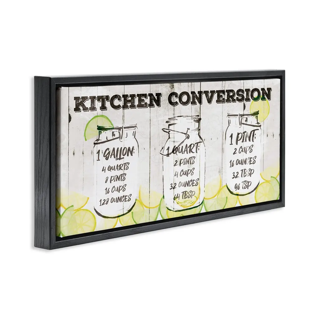 Elevate your home or office to the next level with Stupell Framed Floating Canvas Wall Art. Our premium hand-stretched canvas is mounted securely into a sturdy lightweight frame. The museum-style gap between the wrapped canvas and the box frame gives the illusion of floating artwork. Stupell Wall Art is made in the USA.Features: Dimensions: 25 x 1.7 x 11 Frame, 24 x 1.5 x 10 Canvas ArtFloating Frame Canvas Products are available in sizes 25"x11" and 31"x14". All Floating Frame Canvas Products have a 1.7" Depth.Wall Art is Ready to Hang with Hardware Free Hanging. No Installation required. For Easy Set Up Lean or Layer Artwork on Shelf or Against Wall. Artwork is Permently Fixed into the Frame.Our elevated 1.7" Thick Floating Frame is the perfect complement to our canvas style Wall Art. We use only the highest quality inks in house with industry leading printing solutions. Canvas is hand stretched over a durable wood foundation and then mounted securly into a Modern Box Frame. Made in the USA.Artwork Relates To: Kitchen, Phrase, Conversion, Measurements, Lemon, Country, Chart, FruitDesign by Jace Grey