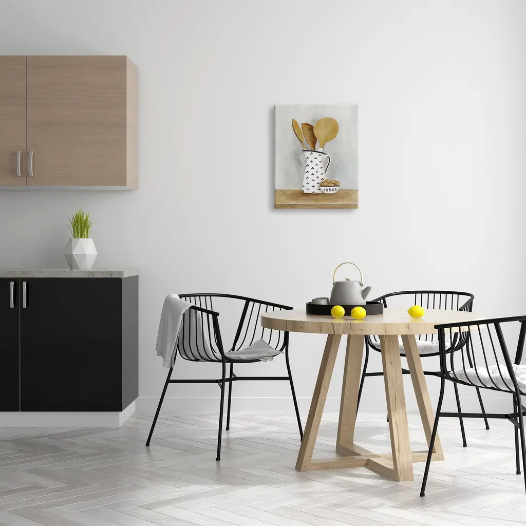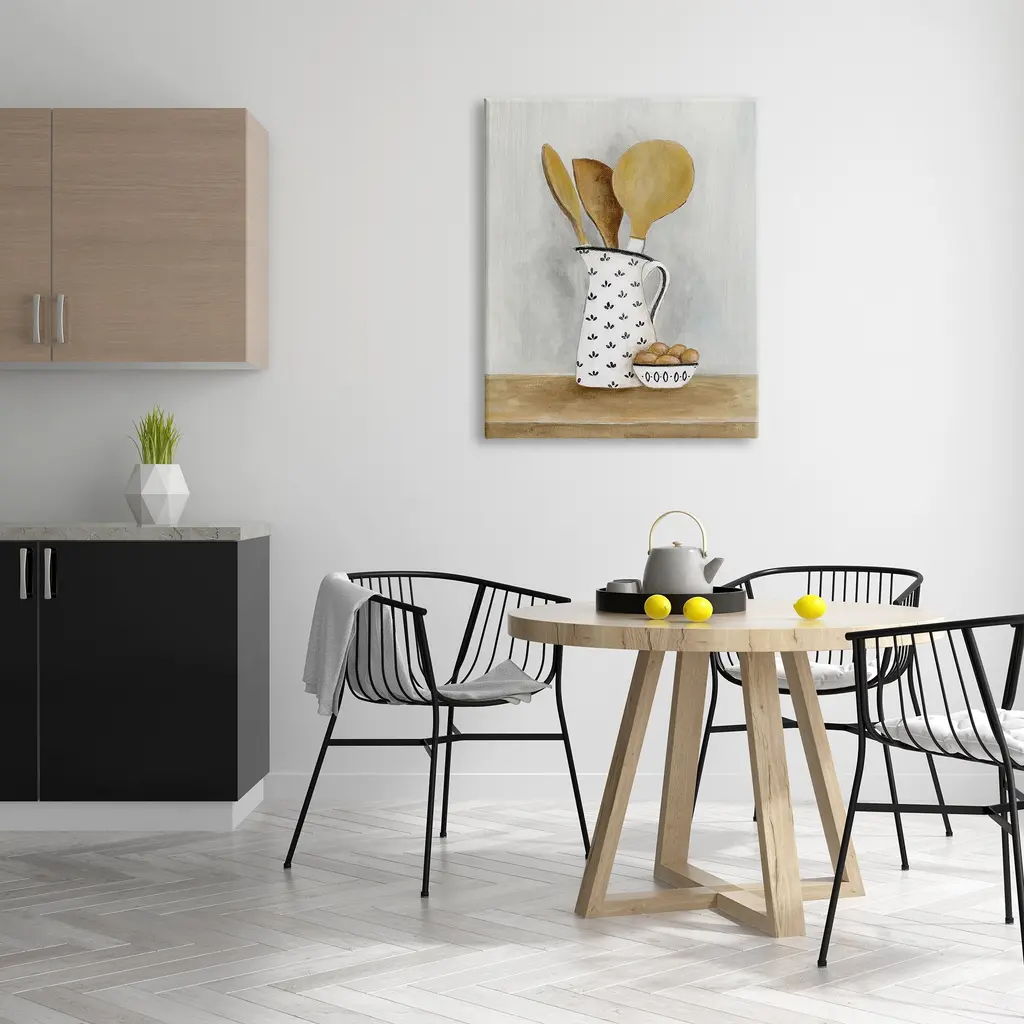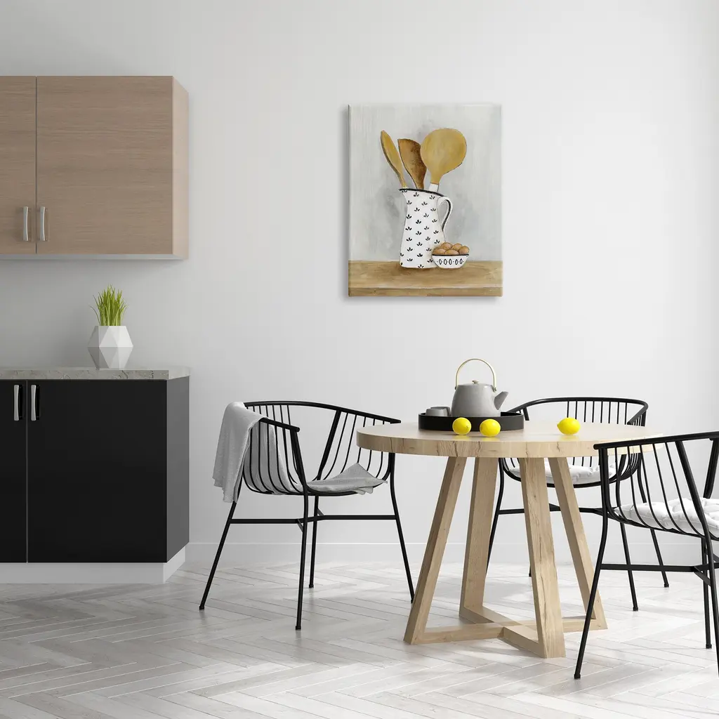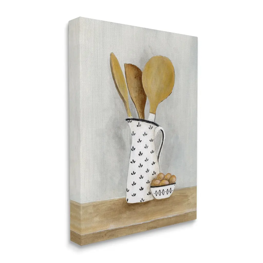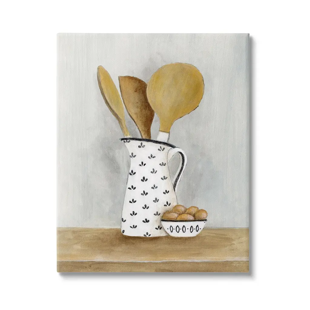 We create our stretched canvas to the highest standards. Using only the highest quality inks and canvas on Mimaki printers, we hand-cut and stretch each piece over a 1.5-inch thick wooden frame for hanging. As a result, the art comes ready to hang on the sturdy ledge with no installation required. Stupell Wall Art is made in the USA.Features: Dimensions: 16 x 1.5 x 20 InchesStretched Canvas Sizes Include Standard: 16 x 1.5 x 20 Large: 20 x 1.5 x 30 X-Large: 30 x 1.5 x 40 Oversized: 36 x 1.5 x 48Wall Art is Ready to Hang - No Installation or Hardware Needed. For Easy Set Up Lean or Layer Artwork on Shelf or Against Wall.Our stretched canvas is created with the highest standards. We use only the highest quality inks and canvas on our in house Mimaki printers, and then hand cut and stretch each piece over a 1.5 inch thick wooden frame for hanging. Made In USA.Artwork Relates To: Cutlery, Spoon, Food, Eggs, Kitchen Utensil, Wooden Spoon, KitchenDesign by Janet Tava