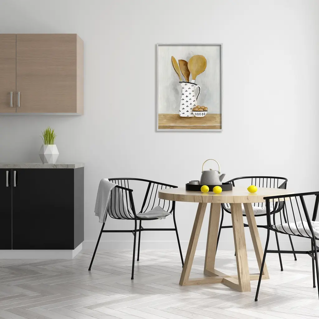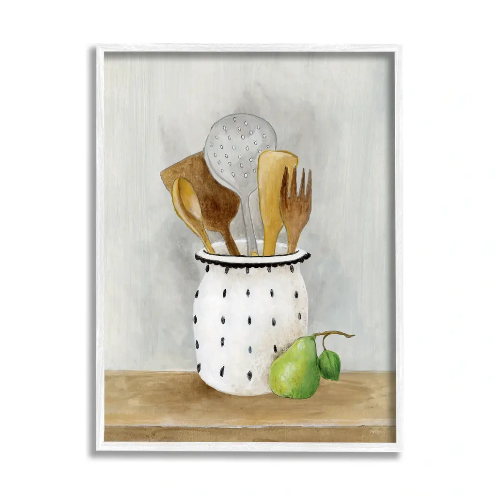 Add dimension to any room with our textured Framed Giclee Artwork. Our framed artwork is securely mounted into a 1.5-inch thick wood grain frame and ready to hang. Frames are available in three alluring styles: black, gray farmhouse and white. In addition, you should check out our oversized options if you want a statement piece. Stupell Wall Art is made in the USA.Features: Dimensions: 11 x 1.5 x 14 FramedFramed Giclee Sizes Include Standard: 11 x 1.5 x 14 Large: 16 x 1.5 x 20 Oversized: 24 x 1.5 x 30Wall Art is Ready to Hang - No Installation or Hardware Needed. For Easy Set Up Lean or Layer Artwork on Shelf or Against Wall.Our giclée prints are carefully mounted on a durable MDF backing, and then perfectly finished in a 1.5 inch thick woodgrain frame. Mounted frame colors include black, gray farmhouse and white. Made In USA.Artwork Relates To: Cutlery, Spoon, Food, Eggs, Kitchen Utensil, Wooden Spoon, KitchenDesign by Janet Tava