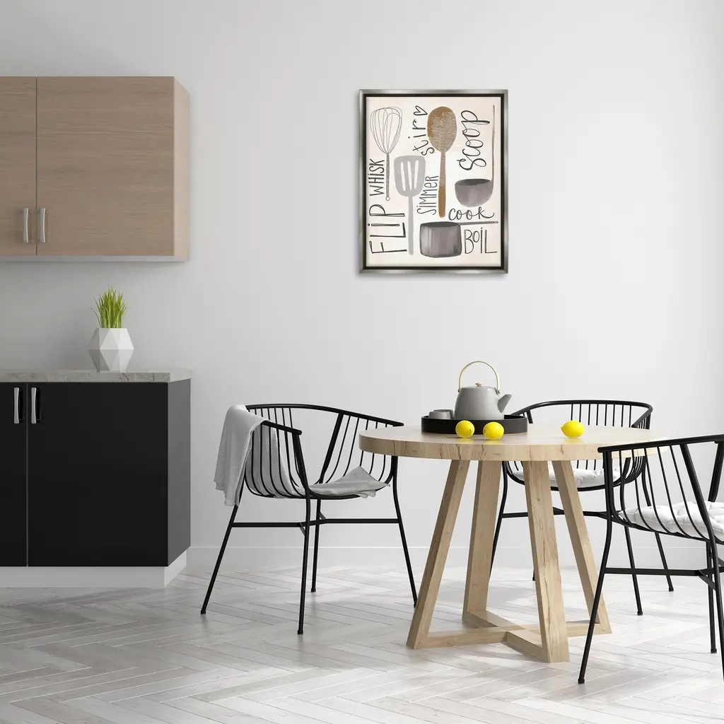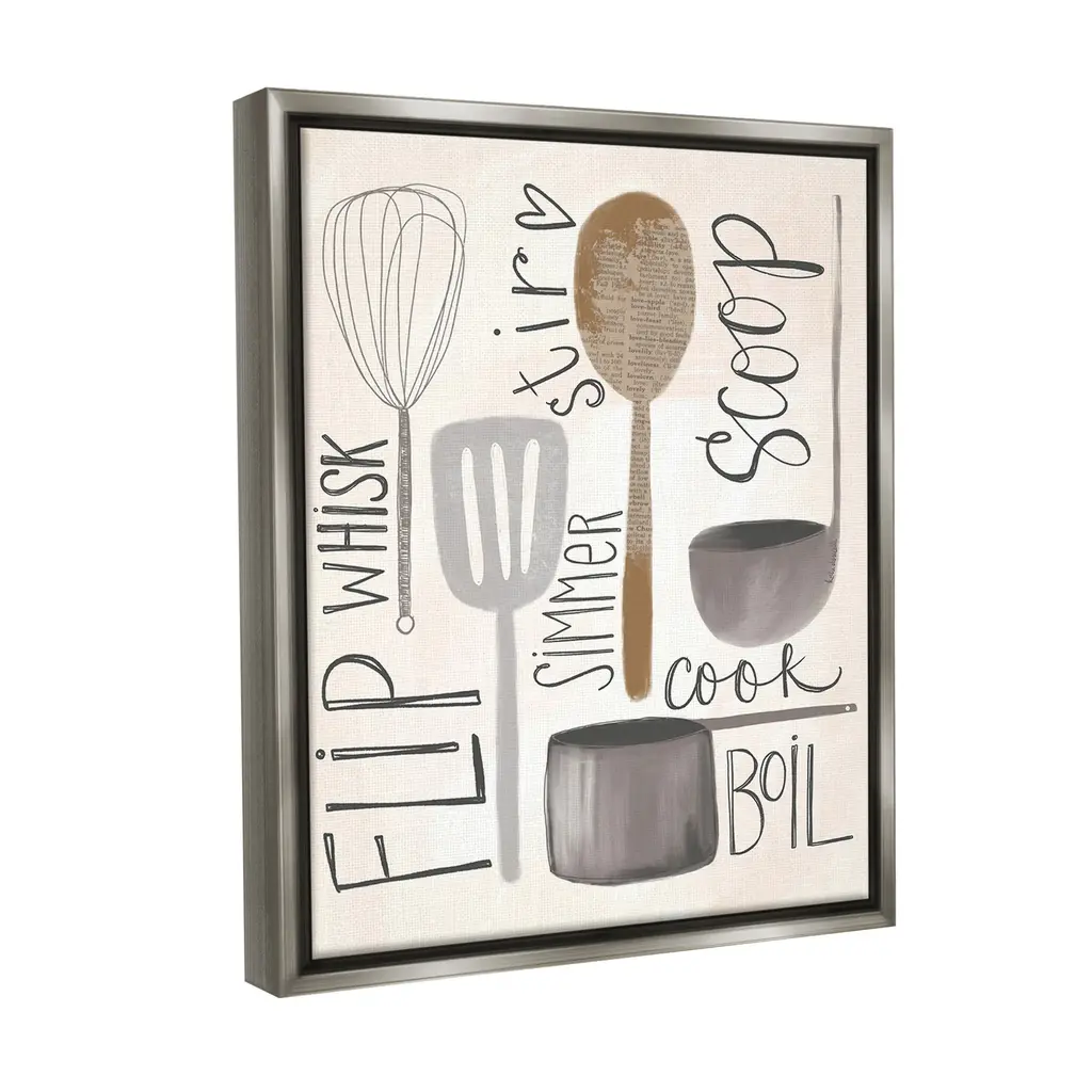 Elevate your home or office to the next level with Stupell Framed Floating Canvas Wall Art. Our premium hand-stretched canvas is mounted securely into a sturdy lightweight frame. The museum-style gap between the wrapped canvas and the box frame gives the illusion of floating artwork. Stupell Wall Art is made in the USA.Features: Dimensions: 17 x 1.7 x 21 Frame, 16 x 1.5 x 20 Canvas ArtFloating Frame Canvas Products are available in sizes 17"x21" and 25"x31". All Floating Frame Canvas Products have a 1.7" Depth.Wall Art is Ready to Hang with Hardware Free Hanging. No Installation required. For Easy Set Up Lean or Layer Artwork on Shelf or Against Wall. Artwork is Permently Fixed into the Frame.Our elevated 1.7" Thick Floating Frame is the perfect complement to our canvas style Wall Art. We use only the highest quality inks in house with industry leading printing solutions. Canvas is hand stretched over a durable wood foundation and then mounted securly into a Modern Box Frame. Made in the USA.Artwork Relates To: Cutlery, Spoon, Kitchen, Utensil, Whisk, Phrases, Simmer, Boil, Scoop, Stir, FlipDesign by Katie Doucette