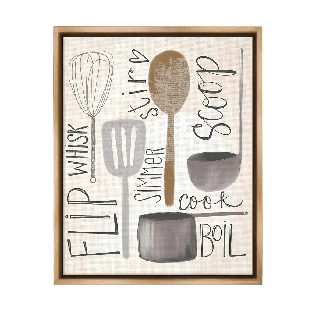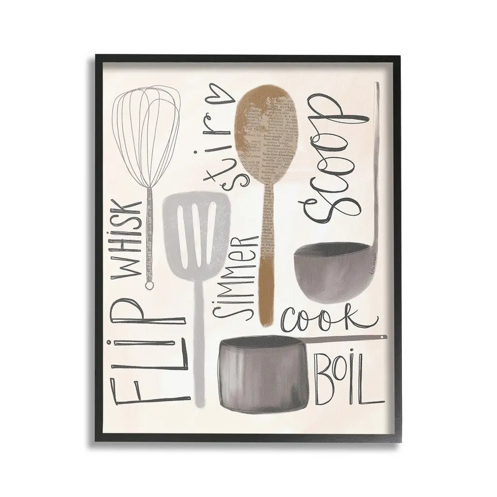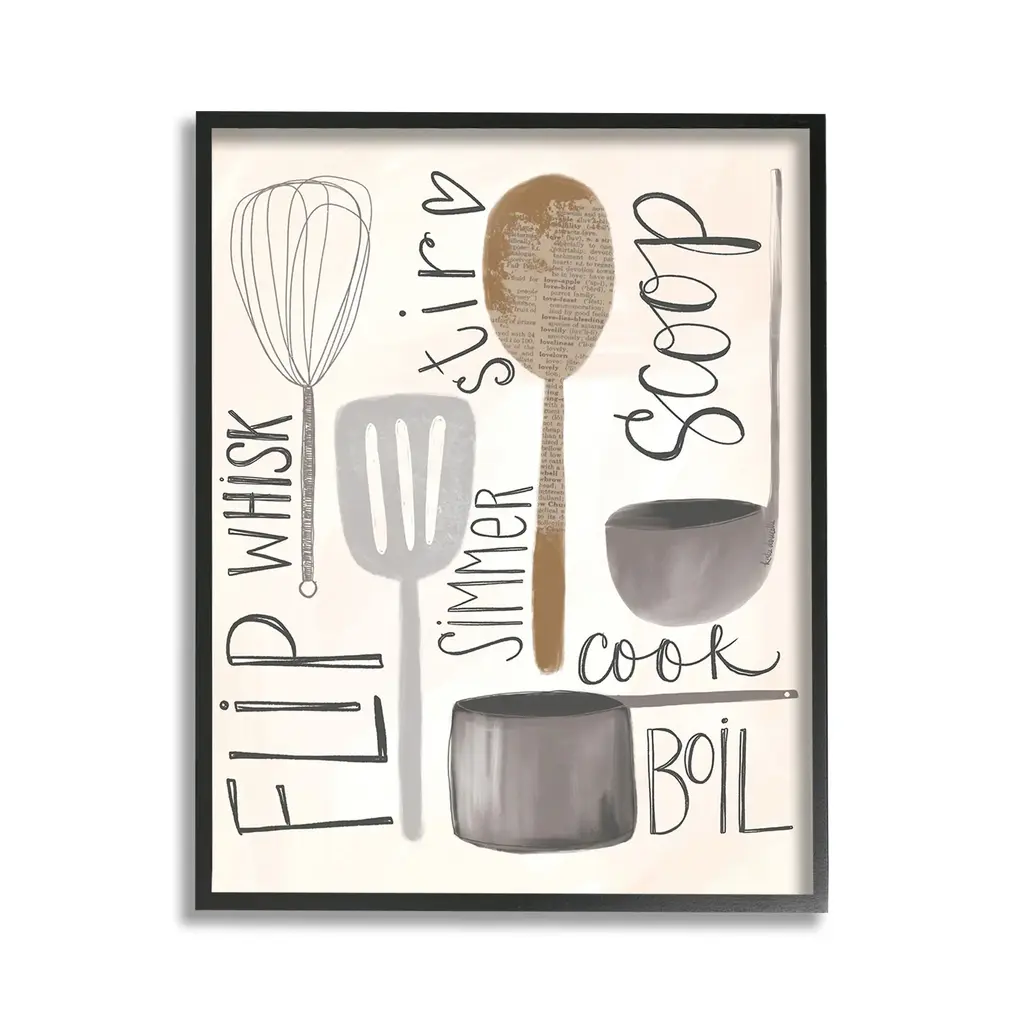 Our wall plaques start as high-quality lithograph prints mounted on durable 0.5-inch thick MDF wood. Each piece is hand finished and comes with a fresh layer of white foil on the sides to give it a crisp, clean look. Plaques arrive ready to hang without installation and come with removable plastic corners to keep them from damage in transit. Stupell Wall Art is made in the USA.Features: Dimensions: 10 x 0.5 x 15 InchesWall Plaque Product Sizes Include 10"x15" and 13"x19". All wall plaque products have a 0.5" Depth. Wall Art is Ready to Hang with Hardware Free Hanging. No installation required. For Easy Set Up Lean or Layer Artwork on Shelf or Against Wall.All of our wall plaques start off as high quality lithograph prints that are then mounted on durable 0.5 inch thick MDF wood. Each piece is hand finished and comes with a fresh layer of foil on the sides to give it a crisp clean look. Made In USA.Artwork Relates To: Cutlery, Spoon, Kitchen, Utensil, Whisk, Phrases, Simmer, Boil, Scoop, Stir, FlipDesign by Katie Doucette