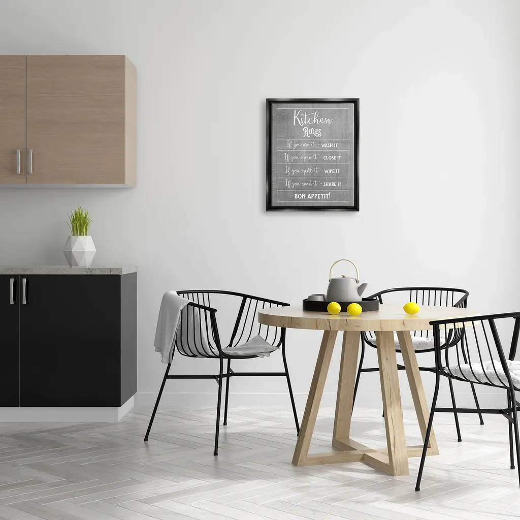 Elevate your home or office to the next level with Stupell Framed Floating Canvas Wall Art. Our premium hand stretched canvas is mounted securly into a sturdy lightweight frame. The museum style gap between wrapped canvas and box frame gives the illusion of floating artwork. Features: Dimensions: 17 x 1.7 x 21 Frame, 16 x 1.5 x 20 Canvas ArtFloating Frame Sizes Include Standard: 17 x 1.7 x 21 Oversized: 25 x 1.7 x 31Wall Art is Ready to Hang - No Installation or Hardware Needed. For Easy Set Up Lean or Layer Artwork on Shelf or Against Wall.Our elevated 1.7" Thick Floating Frame is the perfect complement to our canvas style Wall Art. We use only the highest quality inks in house with industry leading printing solutions. Canvas is hand stretched over a durable wood foundation and then mounted securly into a Modern Box Frame. Made in the USA.Artwork Relates To: Kitchen Rules, List, Kitchen, Lunch, DinnerDesign by Amanda MurrayFirst perfectly in any Kitchen, Dining Room, Bar or Pantry.Text Includes: Kitchen Rules. If You Use It Wash It. If You Open It Close It. If You Spill It Wipe It. If You Cook It Share It. Bon Appetit