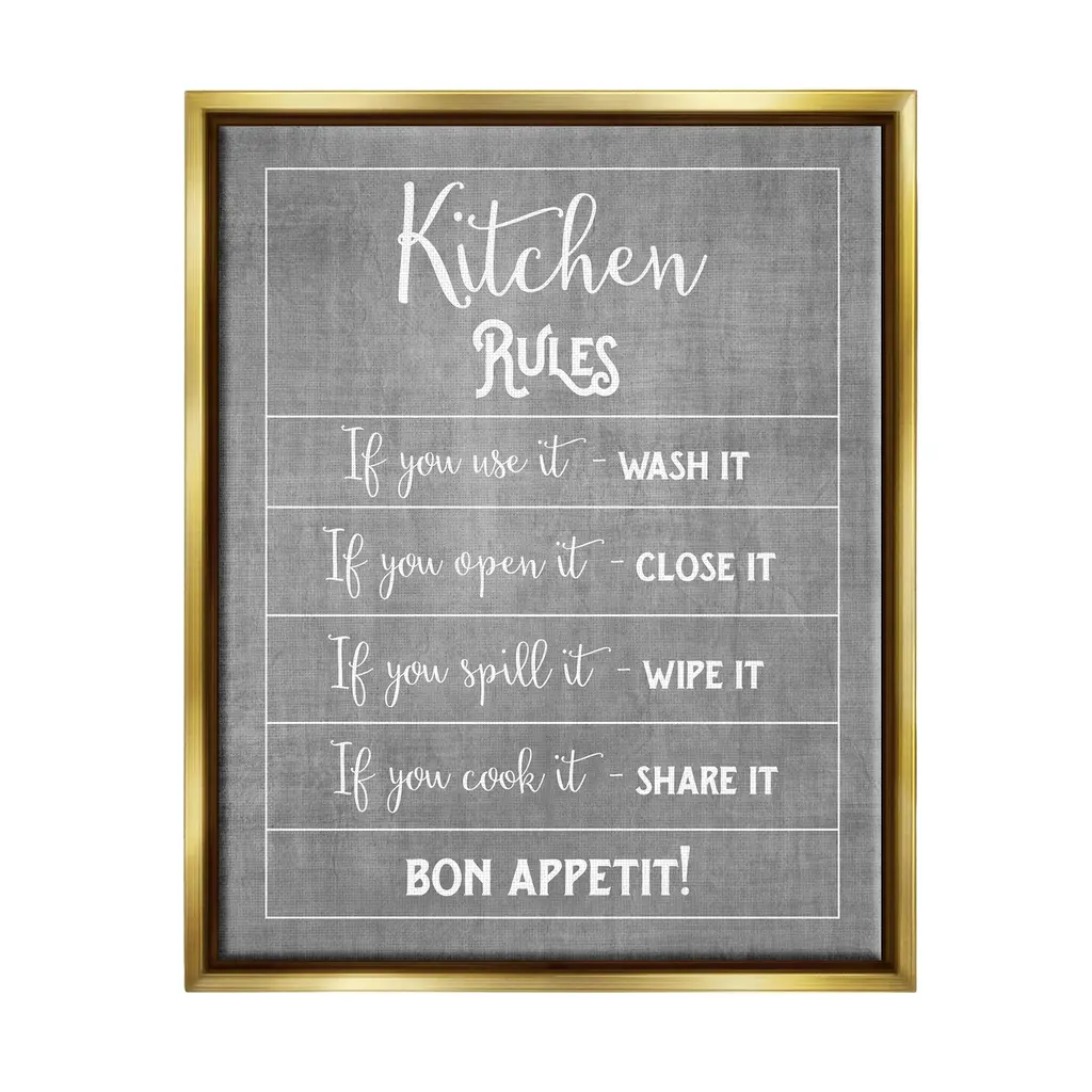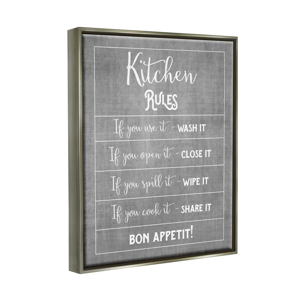 Elevate your home or office to the next level with Stupell Framed Floating Canvas Wall Art. Our premium hand stretched canvas is mounted securly into a sturdy lightweight frame. The museum style gap between wrapped canvas and box frame gives the illusion of floating artwork. Features: Dimensions: 17 x 1.7 x 21 Frame, 16 x 1.5 x 20 Canvas ArtFloating Frame Sizes Include Standard: 17 x 1.7 x 21 Oversized: 25 x 1.7 x 31Wall Art is Ready to Hang - No Installation or Hardware Needed. For Easy Set Up Lean or Layer Artwork on Shelf or Against Wall.Our elevated 1.7" Thick Floating Frame is the perfect complement to our canvas style Wall Art. We use only the highest quality inks in house with industry leading printing solutions. Canvas is hand stretched over a durable wood foundation and then mounted securly into a Modern Box Frame. Made in the USA.Artwork Relates To: Kitchen Rules, List, Kitchen, Lunch, DinnerDesign by Amanda MurrayFirst perfectly in any Kitchen, Dining Room, Bar or Pantry.Text Includes: Kitchen Rules. If You Use It Wash It. If You Open It Close It. If You Spill It Wipe It. If You Cook It Share It. Bon Appetit