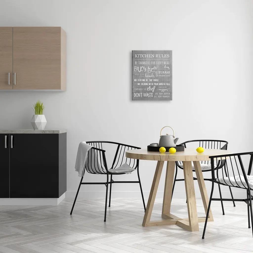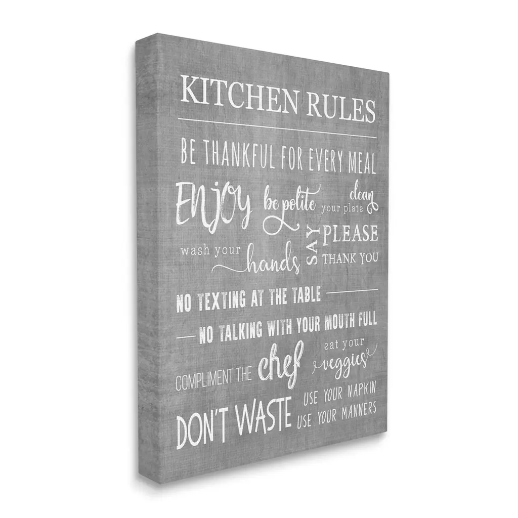 Proudly made in the USA, Our stretched canvas is created with the highest standards. We use only the highest quality inks and canvas on our in house Mimaki printers, and then hand cut and stretch each piece over a 1.5 inch thick wooden frame for hanging. The art comes ready to hang with no installation required.Features: Dimensions: 16 x 1.5 x 20 InchesStretched Canvas Sizes Include Standard: 16 x 1.5 x 20 Large: 20 x 1.5 x 30 X-Large: 30 x 1.5 x 40 Oversized: 36 x 1.5 x 48Wall Art is Ready to Hang - No Installation or Hardware Needed. For Easy Set Up Lean or Layer Artwork on Shelf or Against Wall.Our stretched canvas is created with the highest standards. We use only the highest quality inks and canvas on our in house Mimaki printers, and then hand cut and stretch each piece over a 1.5 inch thick wooden frame for hanging. Made In USA.Artwork Relates To: List, Kitchen, Dinner, Lunch, RulesDesign by CADFirst perfectly in any Kitchen, Dining Room, Bar or Pantry.Text Includes: Kitchen Rules. Be Thankful For Every Meal. Enjoy. Be Polite. Clean Your Plate. Say Please Thank You. Wash Your Hands. No Texting At The Table. No Talking With Your Mouth Full. Compliment The Chef. Eat Your Veggies. Don't Waste. Use Your Napkin. Use Your Manners