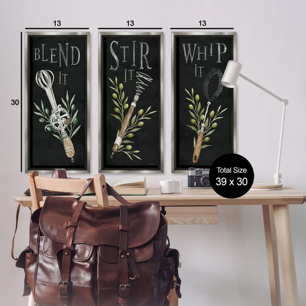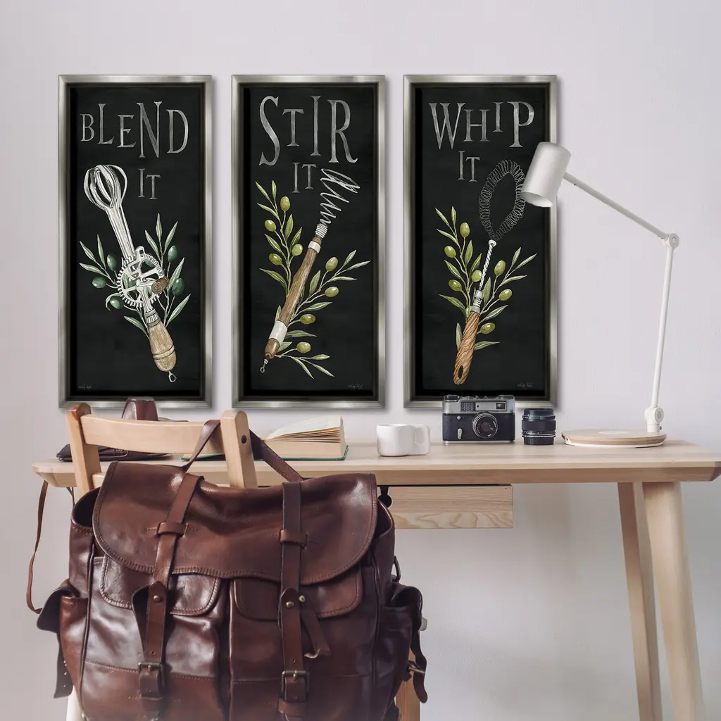 Elevate your home or office to the next level with Stupell Framed Floating Canvas Wall Art. Our premium hand-stretched canvas is mounted securely into a sturdy lightweight frame. The museum-style gap between the wrapped canvas and the box frame gives the illusion of floating artwork. Stupell Wall Art is made in the USA.Features: Dimensions: 3 Piece Set, Each Frame is 11 x 1.7 x 25Three Piece Floating Frame Canvas Products are available as 11"x25" or 14"x31" Panels. All Floating Frame Canvas Products have a 1.7" Depth.Wall Art is Ready to Hang with Hardware Free Hanging. No Installation required. For Easy Set Up Lean or Layer Artwork on Shelf or Against Wall. Artwork is Permently Fixed into the Frame.Our elevated 1.7" Thick Floating Frame is the perfect complement to our canvas style Wall Art. We use only the highest quality inks in house with industry leading printing solutions. Canvas is hand stretched over a durable wood foundation and then mounted securly into a Modern Box Frame. Made in the USA.Artwork Relates To: Kitchen, Utensil, Vintage, Botanical, Plant, Leaf, Blend It, Stir It, Whip ItDesign by Cindy Jacobs
