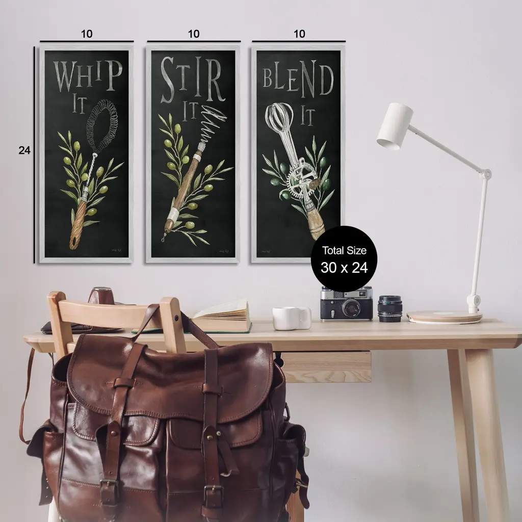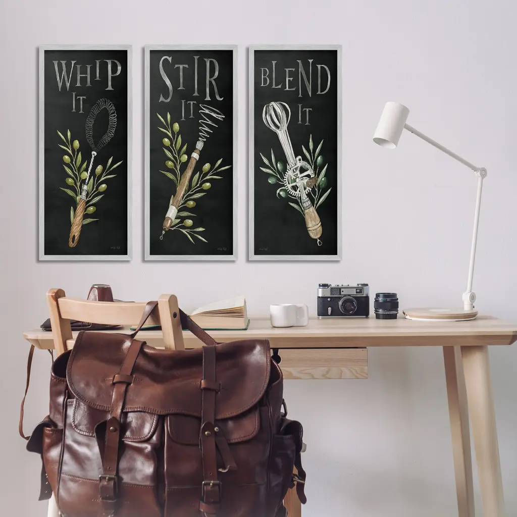 Fill any space in your home or office with our Framed Wall Art Sets. Our framed artwork is securely mounted into a 1.5-inch thick wood grain frame and ready to hang. Frames are available in three alluring styles: black, gray farmhouse and white. Stupell Wall Art is made in the USA.Features: Dimensions: 3 Piece Set, Each Panel is 10 x 1.5 x 24 FramedWall Art is Ready to Hang with Hardware Free Hanging. No installation required. For Easy Set Up Lean or Layer Artwork on Shelf or Against Wall.Curated Wall Art Sets make it easy for you complete the theme for any room. Our giclée prints are carefully mounted on a durable MDF backing, and then perfectly finished in a 1.5 inch thick woodgrain frame. Mounted frame colors include black, gray farmhouse and white. Made In USA.Artwork Relates To: Kitchen, Utensil, Vintage, Botanical, Plant, Leaf, Blend It, Stir It, Whip ItDesign by Cindy Jacobs