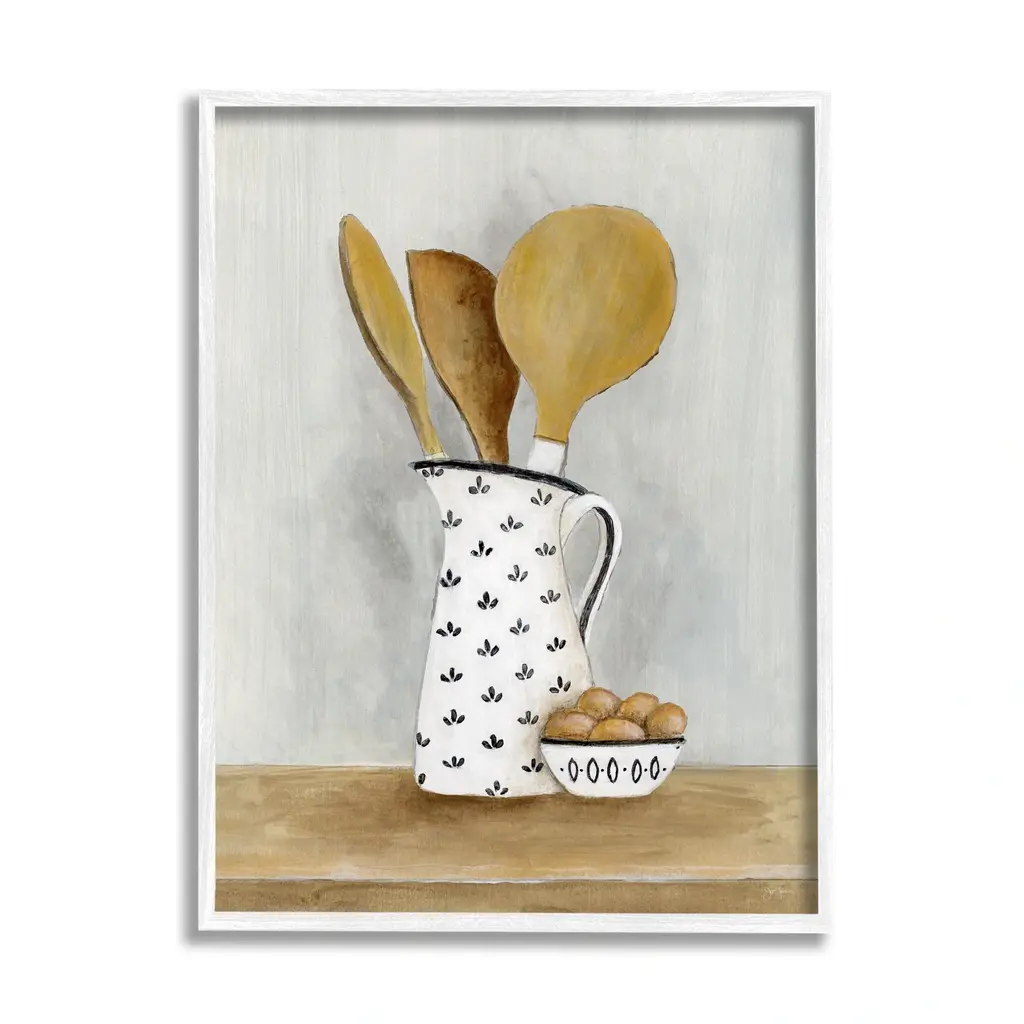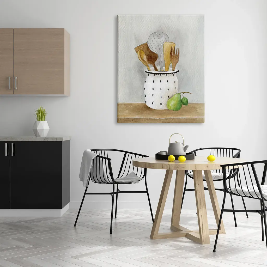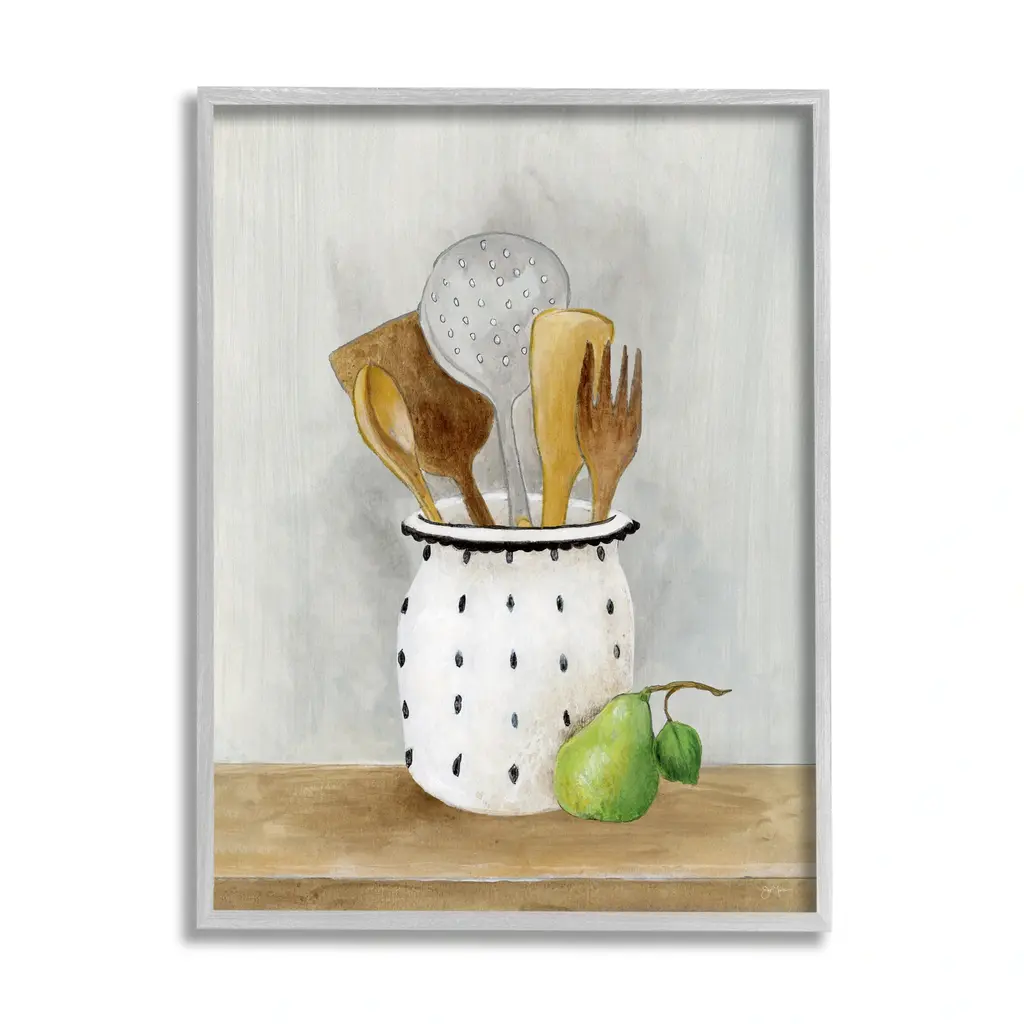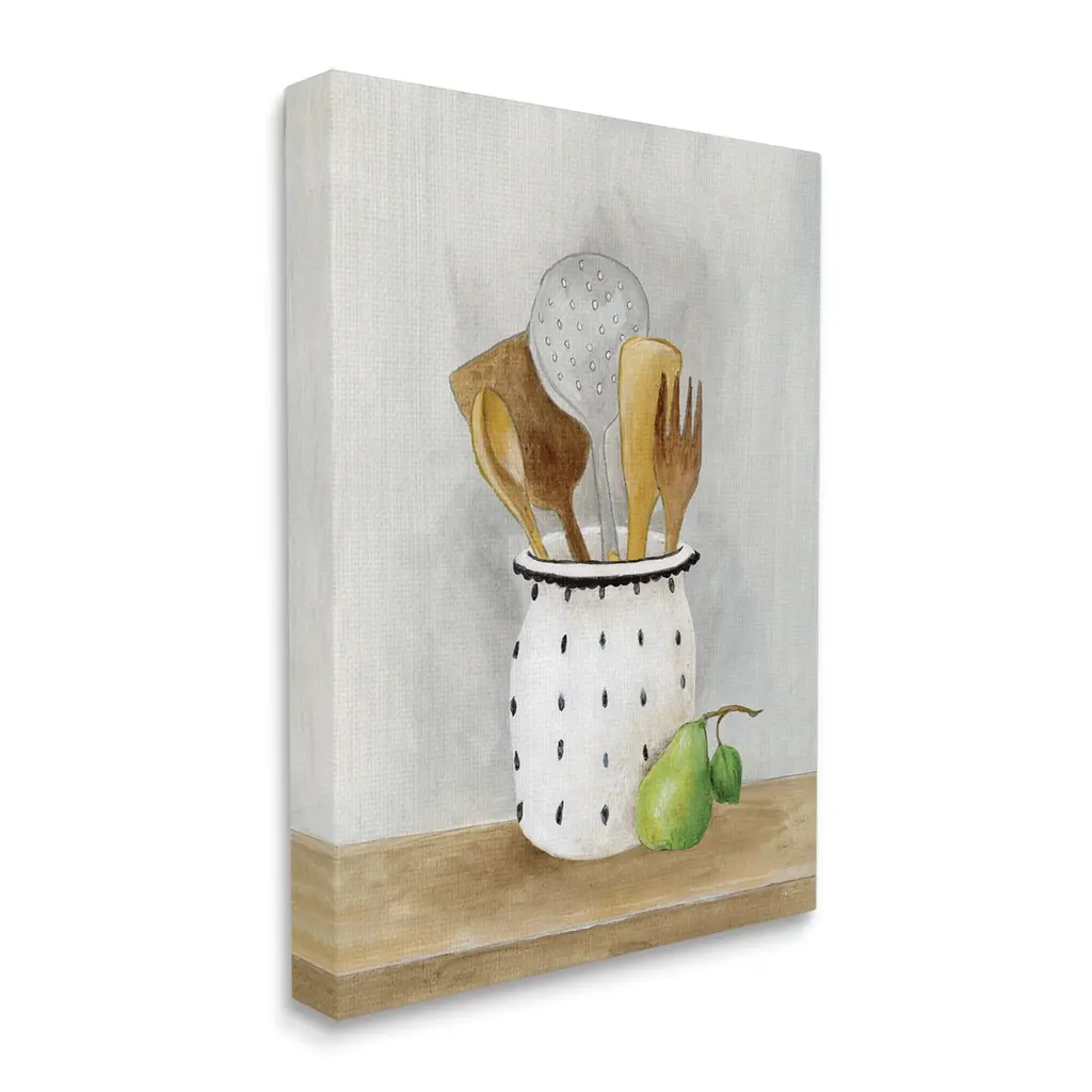 We create our stretched canvas to the highest standards. Using only the highest quality inks and canvas on Mimaki printers, we hand-cut and stretch each piece over a 1.5-inch thick wooden frame for hanging. As a result, the art comes ready to hang on the sturdy ledge with no installation required. Stupell Wall Art is made in the USA.Features: Dimensions: 16 x 1.5 x 20 InchesStretched Canvas Sizes Include Standard: 16 x 1.5 x 20 Large: 20 x 1.5 x 30 X-Large: 30 x 1.5 x 40 Oversized: 36 x 1.5 x 48Wall Art is Ready to Hang - No Installation or Hardware Needed. For Easy Set Up Lean or Layer Artwork on Shelf or Against Wall.Our stretched canvas is created with the highest standards. We use only the highest quality inks and canvas on our in house Mimaki printers, and then hand cut and stretch each piece over a 1.5 inch thick wooden frame for hanging. Made In USA.Artwork Relates To: Cutlery, Spoon, Food, Fruit, Pear, Kitchen Utensil, Wooden Spoon, KitchenDesign by Janet Tava