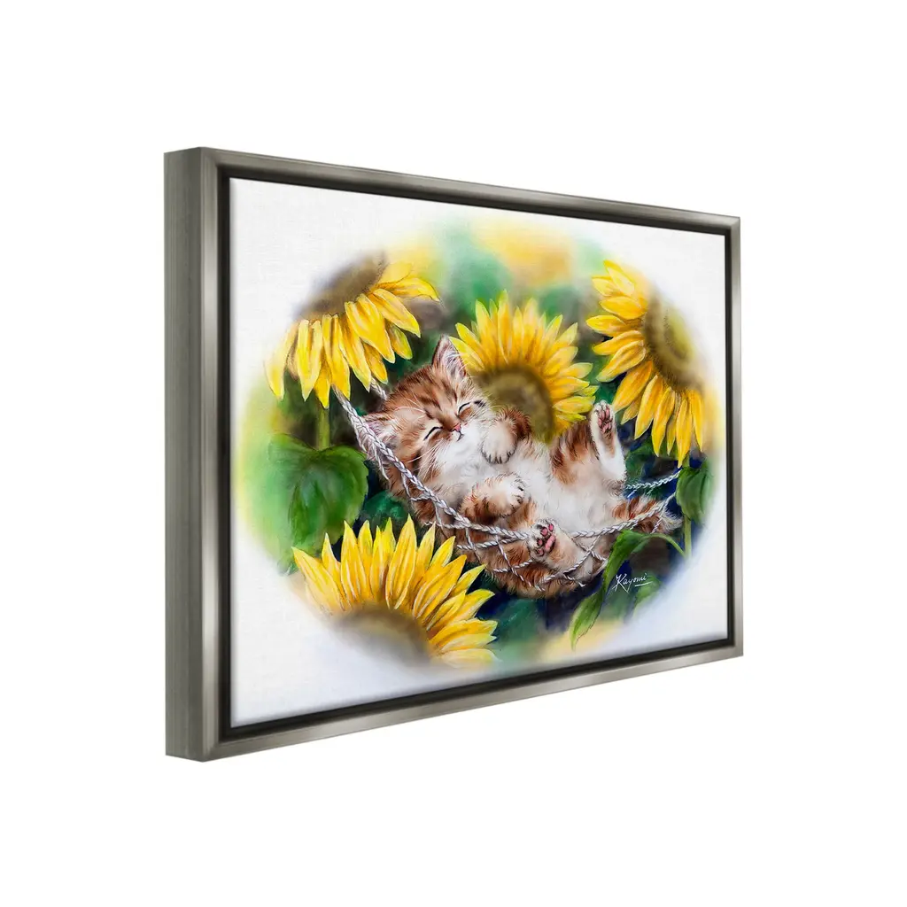 Elevate your home or office to the next level with Stupell Framed Floating Canvas Wall Art. Our premium hand-stretched canvas is mounted securely into a sturdy lightweight frame. The museum-style gap between the wrapped canvas and the box frame gives the illusion of floating artwork. Stupell Wall Art is made in the USA.Features: Dimensions: 21 x 1.7 x 17 Frame, 20 x 1.5 x 16 Canvas ArtFloating Frame Canvas Products are available in sizes 21"x17" and 31"x25". All Floating Frame Canvas Products have a 1.7" Depth.Wall Art is Ready to Hang with Hardware Free Hanging. No Installation required. For Easy Set Up Lean or Layer Artwork on Shelf or Against Wall. Artwork is Permently Fixed into the Frame.Our elevated 1.7" Thick Floating Frame is the perfect complement to our canvas style Wall Art. We use only the highest quality inks in house with industry leading printing solutions. Canvas is hand stretched over a durable wood foundation and then mounted securly into a Modern Box Frame. Made in the USA.Artwork Relates To: Animal, Cat, Mammal, Pet, Kitten, Sunflower, Meadow, Hammock, Flower, Floral, Country, CottageDesign by Kayomi Harai