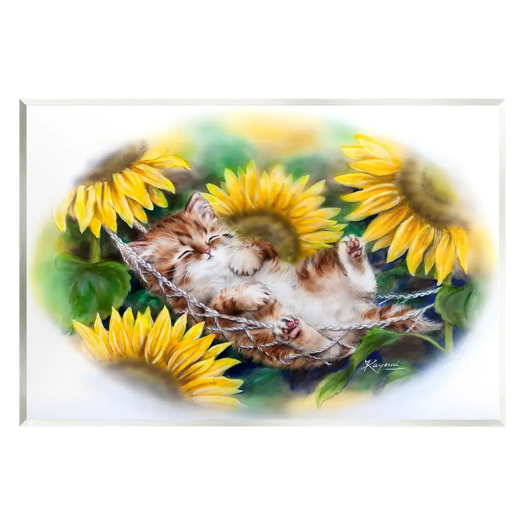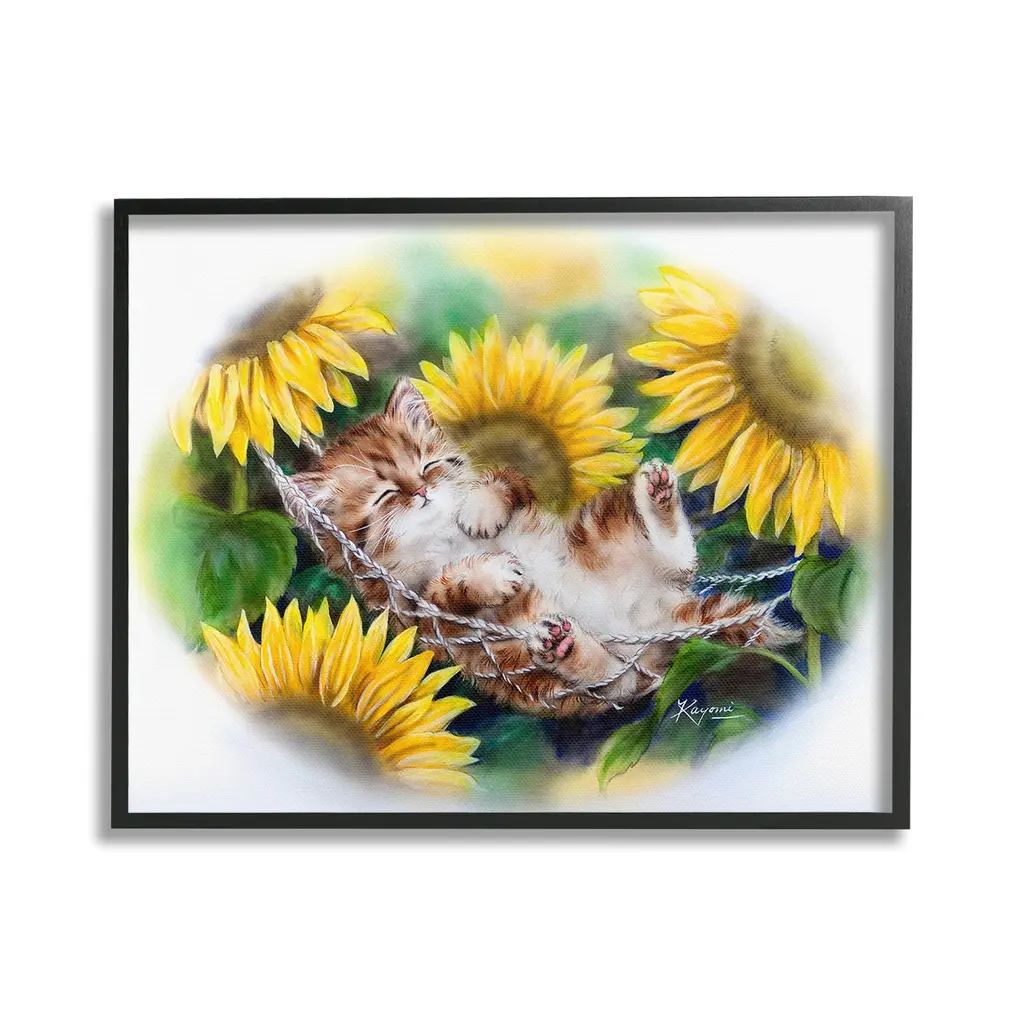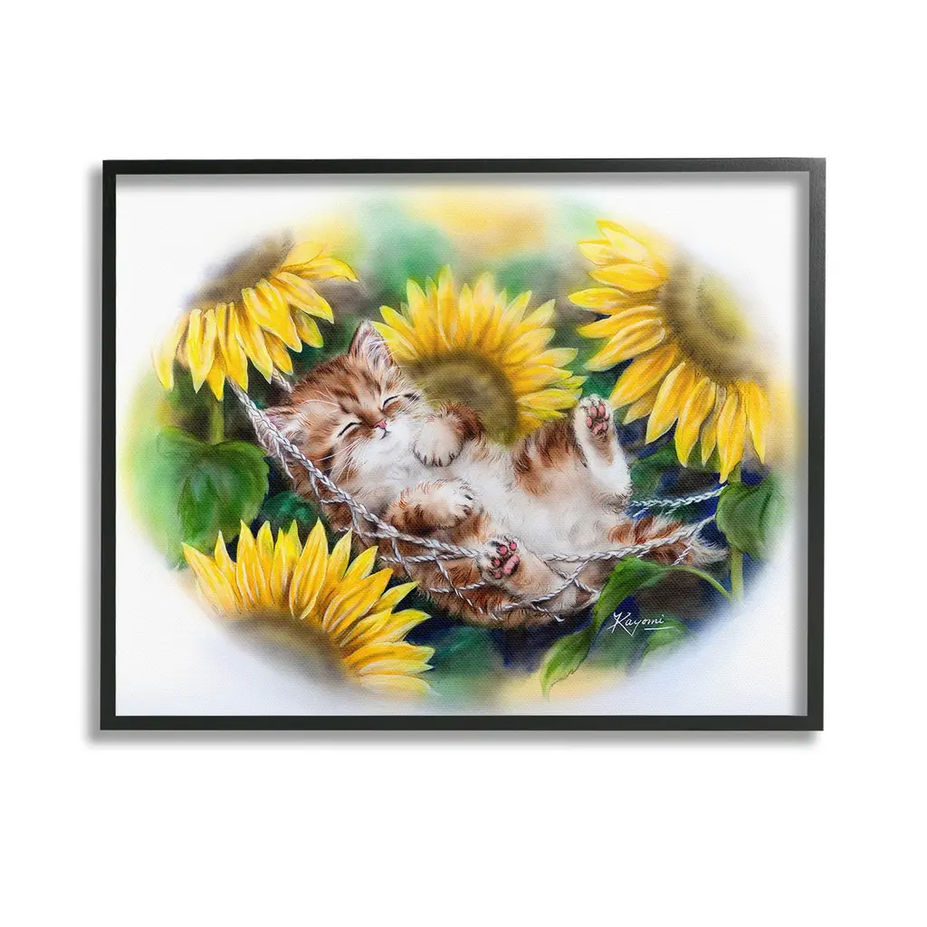 Add dimension to any room with our textured Framed Giclee Artwork. Our framed artwork is securely mounted into a 1.5-inch thick wood grain frame and ready to hang. Frames are available in three alluring styles: black, gray farmhouse and white. In addition, you should check out our oversized options if you want a statement piece. Stupell Wall Art is made in the USA.Features: Dimensions: 14 x 1.5 x 11 FramedFramed Giclee Products are available in the sizes 14"x11", 20"x16" or 30"x24". All Framed Giclee Products have a 1.5" Depth. Wall Art is Ready to Hang with Hardware Free Hanging. No installation required. For Easy Set Up Lean or Layer Artwork on Shelf or Against Wall.Our giclée prints are carefully mounted on a durable MDF backing, and then perfectly finished in a 1.5 inch thick woodgrain frame. Mounted frame colors include black, gray farmhouse and white. Made In USA.Artwork Relates To: Animal, Cat, Mammal, Pet, Kitten, Sunflower, Meadow, Hammock, Flower, Floral, Country, CottageDesign by Kayomi Harai