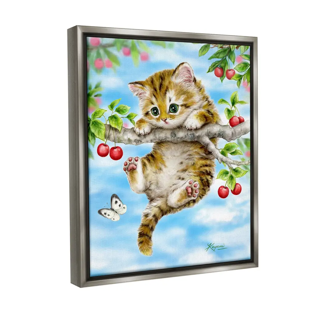 Elevate your home or office to the next level with Stupell Framed Floating Canvas Wall Art. Our premium hand-stretched canvas is mounted securely into a sturdy lightweight frame. The museum-style gap between the wrapped canvas and the box frame gives the illusion of floating artwork. Stupell Wall Art is made in the USA.Features: Dimensions: 17 x 1.7 x 21 Frame, 16 x 1.5 x 20 Canvas ArtFloating Frame Canvas Products are available in sizes 17"x21" and 25"x31". All Floating Frame Canvas Products have a 1.7" Depth.Wall Art is Ready to Hang with Hardware Free Hanging. No Installation required. For Easy Set Up Lean or Layer Artwork on Shelf or Against Wall. Artwork is Permently Fixed into the Frame.Our elevated 1.7" Thick Floating Frame is the perfect complement to our canvas style Wall Art. We use only the highest quality inks in house with industry leading printing solutions. Canvas is hand stretched over a durable wood foundation and then mounted securly into a Modern Box Frame. Made in the USA.Artwork Relates To: Animal, Cat, Mammal, Pet, Kitten, Tree, Cherry, Butterfly, NatureDesign by Kayomi Harai