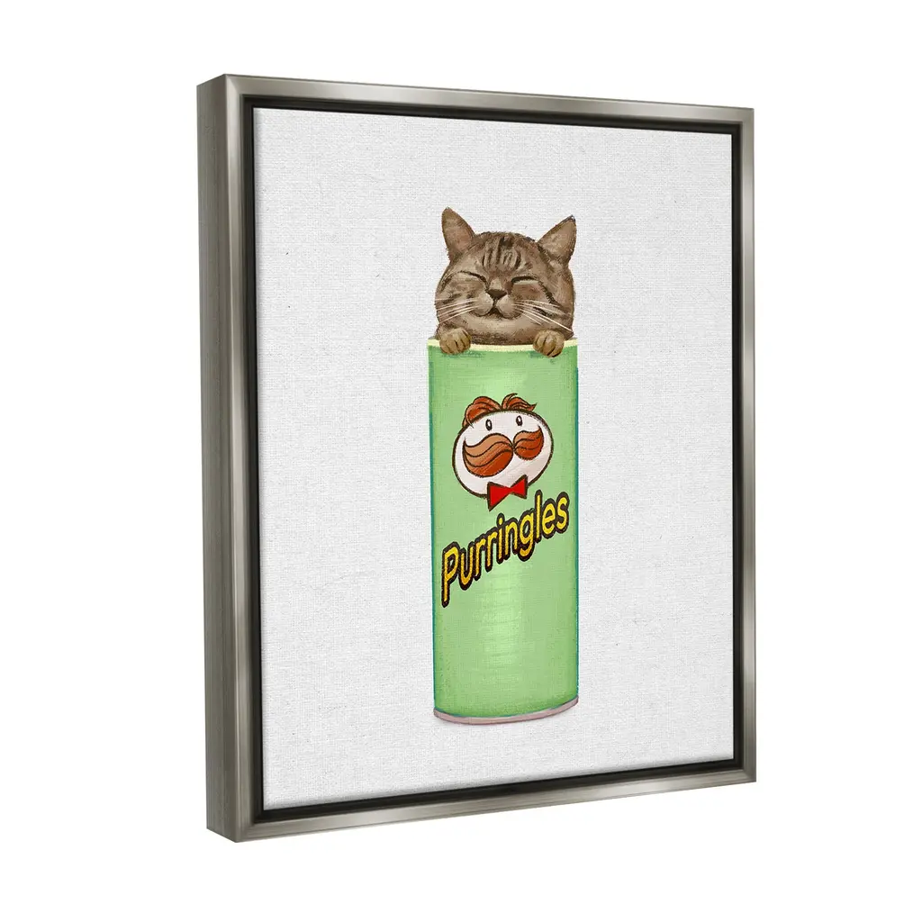 Elevate your home or office to the next level with Stupell Framed Floating Canvas Wall Art. Our premium hand-stretched canvas is mounted securely into a sturdy lightweight frame. The museum-style gap between the wrapped canvas and the box frame gives the illusion of floating artwork. Stupell Wall Art is made in the USA.Features: Dimensions: 17 x 1.7 x 21 Frame, 16 x 1.5 x 20 Canvas ArtFloating Frame Canvas Products are available in sizes 17"x21" and 25"x31". All Floating Frame Canvas Products have a 1.7" Depth.Wall Art is Ready to Hang with Hardware Free Hanging. No Installation required. For Easy Set Up Lean or Layer Artwork on Shelf or Against Wall. Artwork is Permently Fixed into the Frame.Our elevated 1.7" Thick Floating Frame is the perfect complement to our canvas style Wall Art. We use only the highest quality inks in house with industry leading printing solutions. Canvas is hand stretched over a durable wood foundation and then mounted securly into a Modern Box Frame. Made in the USA.Artwork Relates To: Tin, Can, Animal, Cat, Mammal, Pet, Snack, Chips, KittenDesign by Ziwei Li