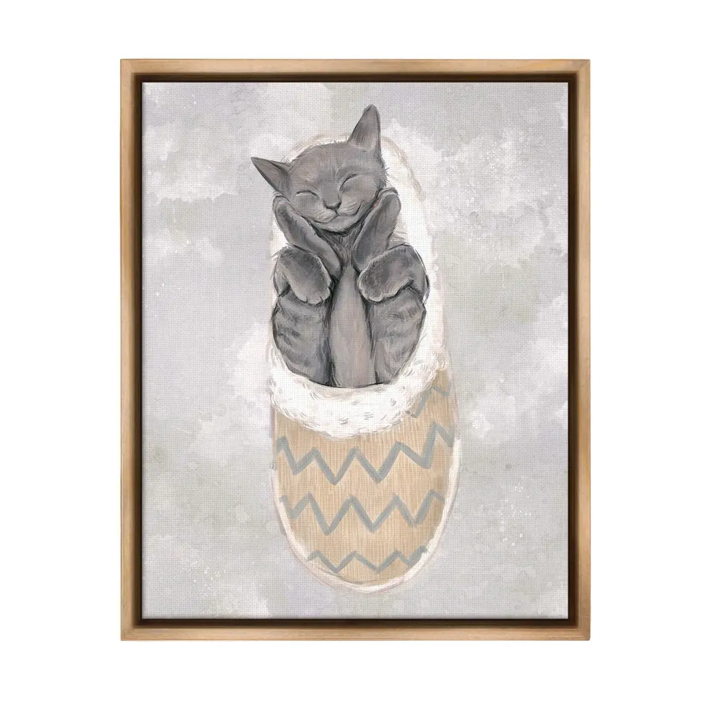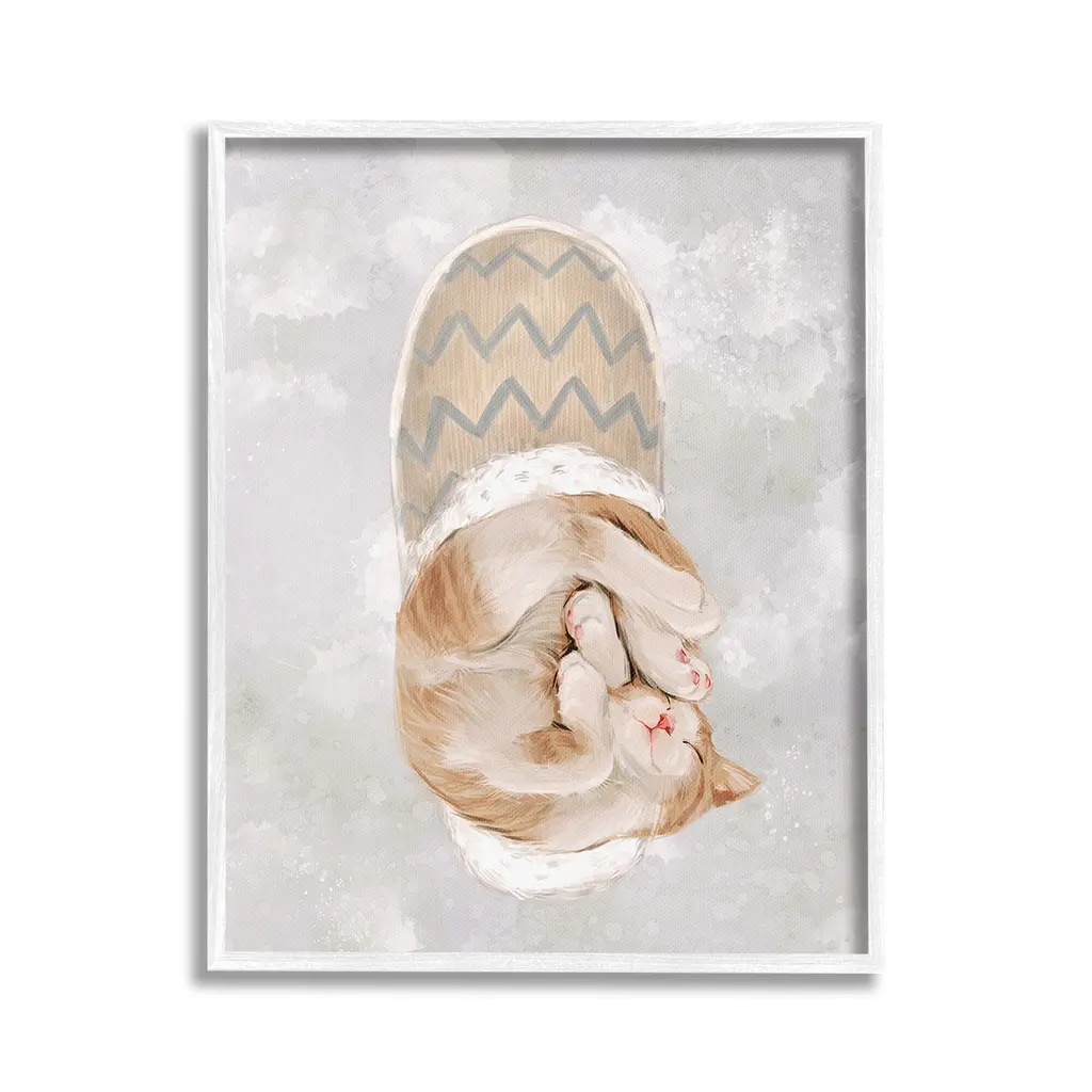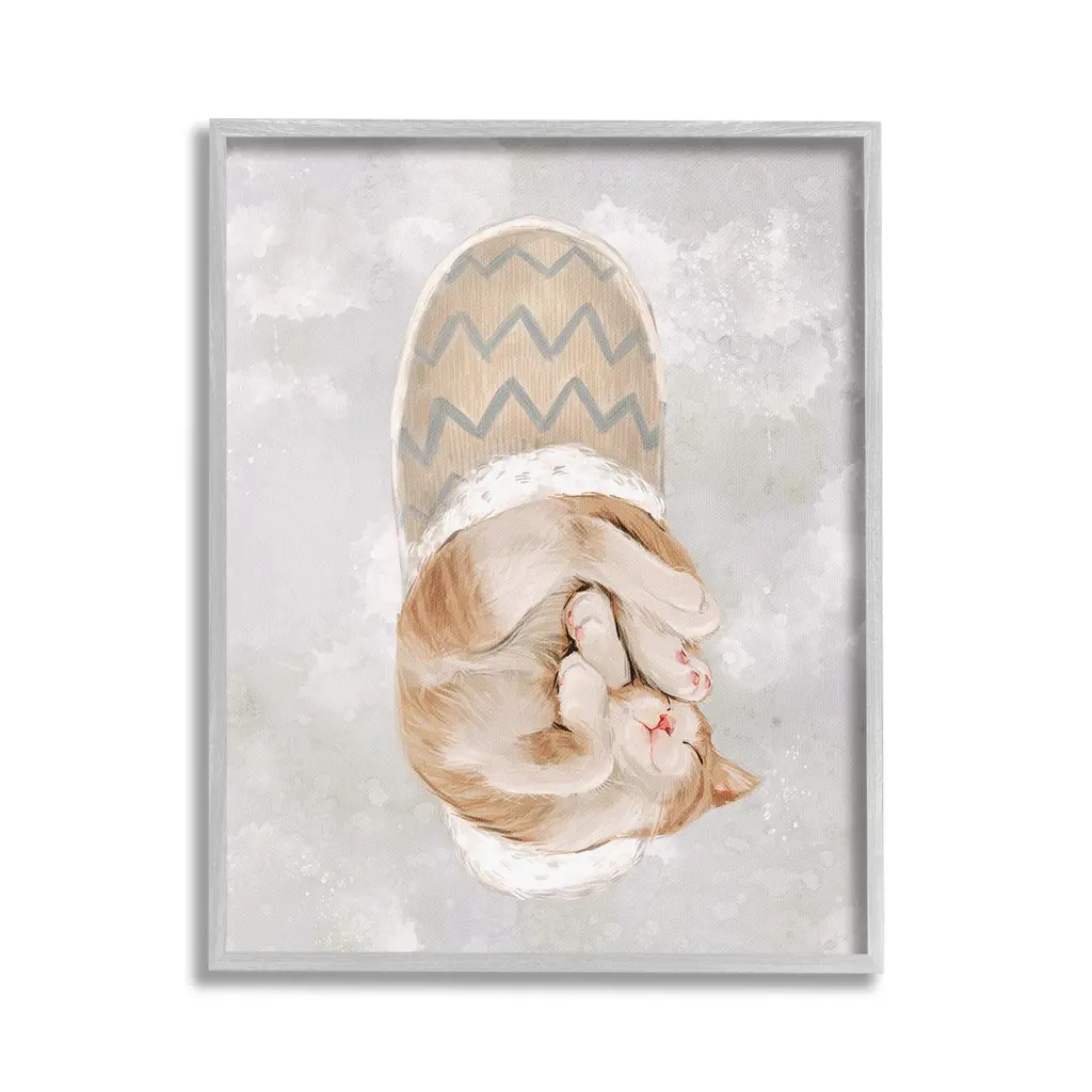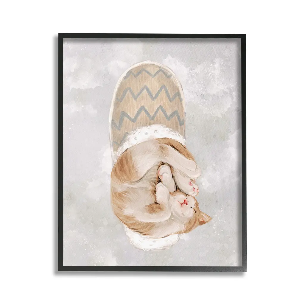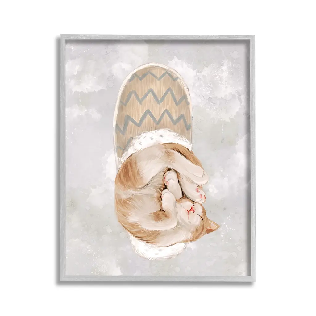 Add dimension to any room with our textured Framed Giclee Artwork. Our framed artwork is securely mounted into a 1.5-inch thick wood grain frame and ready to hang. Frames are available in three alluring styles: black, gray farmhouse and white. In addition, you should check out our oversized options if you want a statement piece. Stupell Wall Art is made in the USA.Features: Dimensions: 11 x 1.5 x 14 FramedFramed Giclee Products are available in the sizes 11"x14", 16"x20" or 24"x30". All Framed Giclee Products have a 1.5" Depth. Wall Art is Ready to Hang with Hardware Free Hanging. No installation required. For Easy Set Up Lean or Layer Artwork on Shelf or Against Wall.Our giclée prints are carefully mounted on a durable MDF backing, and then perfectly finished in a 1.5 inch thick woodgrain frame. Mounted frame colors include black, gray farmhouse and white. Made In USA.Artwork Relates To: Animal, Pet, Cat, Kitten, Slipper, Cozy, Rest, Relax, SleepDesign by Ziwei Li