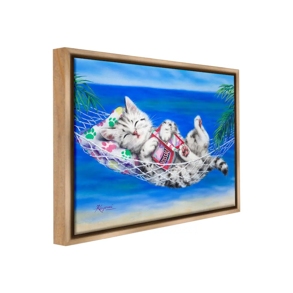 Elevate your home or office to the next level with Stupell Framed Floating Canvas Wall Art. Our premium hand-stretched canvas is mounted securely into a sturdy lightweight frame. The museum-style gap between the wrapped canvas and the box frame gives the illusion of floating artwork. Stupell Wall Art is made in the USA.Features: Dimensions: 21 x 1.7 x 17 Frame, 20 x 1.5 x 16 Canvas ArtFloating Frame Canvas Products are available in sizes 21"x17" and 31"x25". All Floating Frame Canvas Products have a 1.7" Depth.Wall Art is Ready to Hang with Hardware Free Hanging. No Installation required. For Easy Set Up Lean or Layer Artwork on Shelf or Against Wall. Artwork is Permently Fixed into the Frame.Our elevated 1.7" Thick Floating Frame is the perfect complement to our canvas style Wall Art. We use only the highest quality inks in house with industry leading printing solutions. Canvas is hand stretched over a durable wood foundation and then mounted securly into a Modern Box Frame. Made in the USA.Artwork Relates To: Animal, Cat, Mammal, Pet, Kitten, Hammock, Tropical, Beach, Shore, SummerDesign by Kayomi Harai