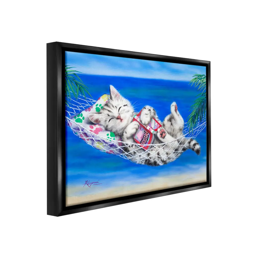 Elevate your home or office to the next level with Stupell Framed Floating Canvas Wall Art. Our premium hand-stretched canvas is mounted securely into a sturdy lightweight frame. The museum-style gap between the wrapped canvas and the box frame gives the illusion of floating artwork. Stupell Wall Art is made in the USA.Features: Dimensions: 21 x 1.7 x 17 Frame, 20 x 1.5 x 16 Canvas ArtFloating Frame Canvas Products are available in sizes 21"x17" and 31"x25". All Floating Frame Canvas Products have a 1.7" Depth.Wall Art is Ready to Hang with Hardware Free Hanging. No Installation required. For Easy Set Up Lean or Layer Artwork on Shelf or Against Wall. Artwork is Permently Fixed into the Frame.Our elevated 1.7" Thick Floating Frame is the perfect complement to our canvas style Wall Art. We use only the highest quality inks in house with industry leading printing solutions. Canvas is hand stretched over a durable wood foundation and then mounted securly into a Modern Box Frame. Made in the USA.Artwork Relates To: Animal, Cat, Mammal, Pet, Kitten, Hammock, Tropical, Beach, Shore, SummerDesign by Kayomi Harai