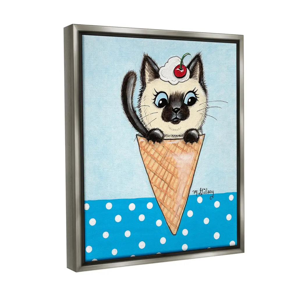 Elevate your home or office to the next level with Stupell Framed Floating Canvas Wall Art. Our premium hand-stretched canvas is mounted securely into a sturdy lightweight frame. The museum-style gap between the wrapped canvas and the box frame gives the illusion of floating artwork. Stupell Wall Art is made in the USA.Features: Dimensions: 17 x 1.7 x 21 Frame, 16 x 1.5 x 20 Canvas ArtFloating Frame Canvas Products are available in sizes 17"x21" and 25"x31". All Floating Frame Canvas Products have a 1.7" Depth.Wall Art is Ready to Hang with Hardware Free Hanging. No Installation required. For Easy Set Up Lean or Layer Artwork on Shelf or Against Wall. Artwork is Permently Fixed into the Frame.Our elevated 1.7" Thick Floating Frame is the perfect complement to our canvas style Wall Art. We use only the highest quality inks in house with industry leading printing solutions. Canvas is hand stretched over a durable wood foundation and then mounted securly into a Modern Box Frame. Made in the USA.Artwork Relates To: Dessert, Food, Ice Cream, Animal, Cat, Mammal, Pet, Sundae, Polka Dot, Pattern, KittenDesign by Michelle Gilsey