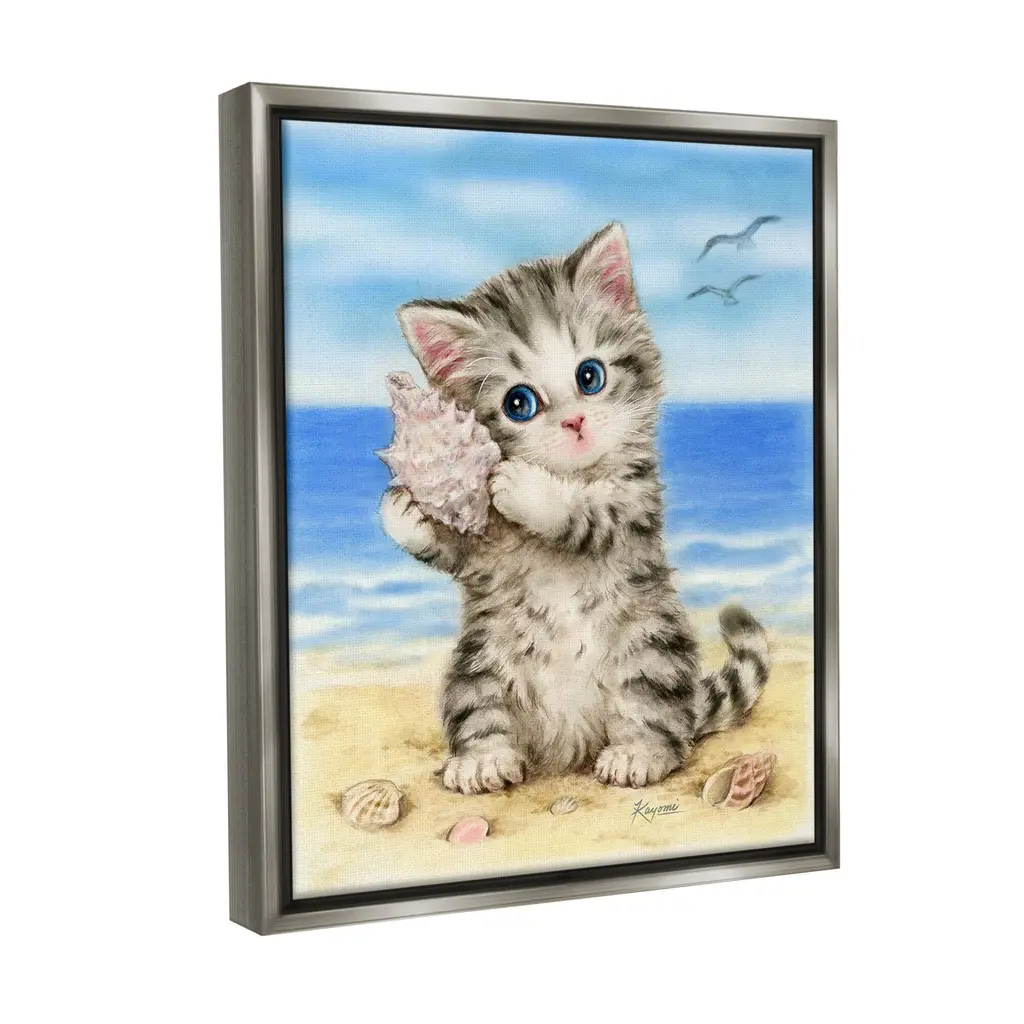 Elevate your home or office to the next level with Stupell Framed Floating Canvas Wall Art. Our premium hand-stretched canvas is mounted securely into a sturdy lightweight frame. The museum-style gap between the wrapped canvas and the box frame gives the illusion of floating artwork. Stupell Wall Art is made in the USA.Features: Dimensions: 17 x 1.7 x 21 Frame, 16 x 1.5 x 20 Canvas ArtFloating Frame Canvas Products are available in sizes 17"x21" and 25"x31". All Floating Frame Canvas Products have a 1.7" Depth.Wall Art is Ready to Hang with Hardware Free Hanging. No Installation required. For Easy Set Up Lean or Layer Artwork on Shelf or Against Wall. Artwork is Permently Fixed into the Frame.Our elevated 1.7" Thick Floating Frame is the perfect complement to our canvas style Wall Art. We use only the highest quality inks in house with industry leading printing solutions. Canvas is hand stretched over a durable wood foundation and then mounted securly into a Modern Box Frame. Made in the USA.Artwork Relates To: Animal, Cat, Mammal, Pet, Kitten, Seashell, Beach, Nautical, Tropical, Seagull, BirdDesign by Kayomi Harai