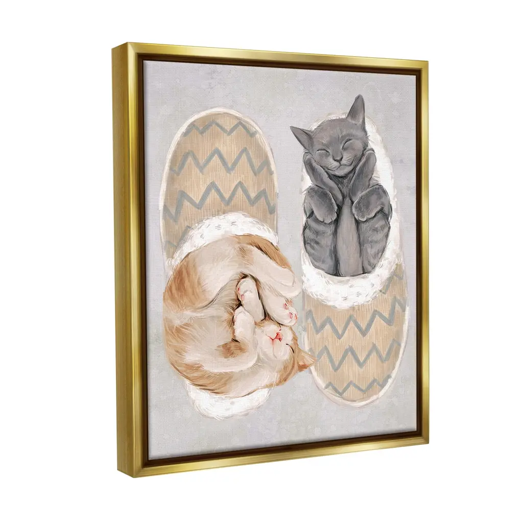 Elevate your home or office to the next level with Stupell Framed Floating Canvas Wall Art. Our premium hand-stretched canvas is mounted securely into a sturdy lightweight frame. The museum-style gap between the wrapped canvas and the box frame gives the illusion of floating artwork. Stupell Wall Art is made in the USA.Features: Dimensions: 17 x 1.7 x 21 Frame, 16 x 1.5 x 20 Canvas ArtFloating Frame Canvas Products are available in sizes 17"x21" and 25"x31". All Floating Frame Canvas Products have a 1.7" Depth.Wall Art is Ready to Hang with Hardware Free Hanging. No Installation required. For Easy Set Up Lean or Layer Artwork on Shelf or Against Wall. Artwork is Permently Fixed into the Frame.Our elevated 1.7" Thick Floating Frame is the perfect complement to our canvas style Wall Art. We use only the highest quality inks in house with industry leading printing solutions. Canvas is hand stretched over a durable wood foundation and then mounted securly into a Modern Box Frame. Made in the USA.Artwork Relates To: Animal, Pet, Cat, Kitten, Slipper, Cozy, Rest, Relax, SleepDesign by Ziwei Li