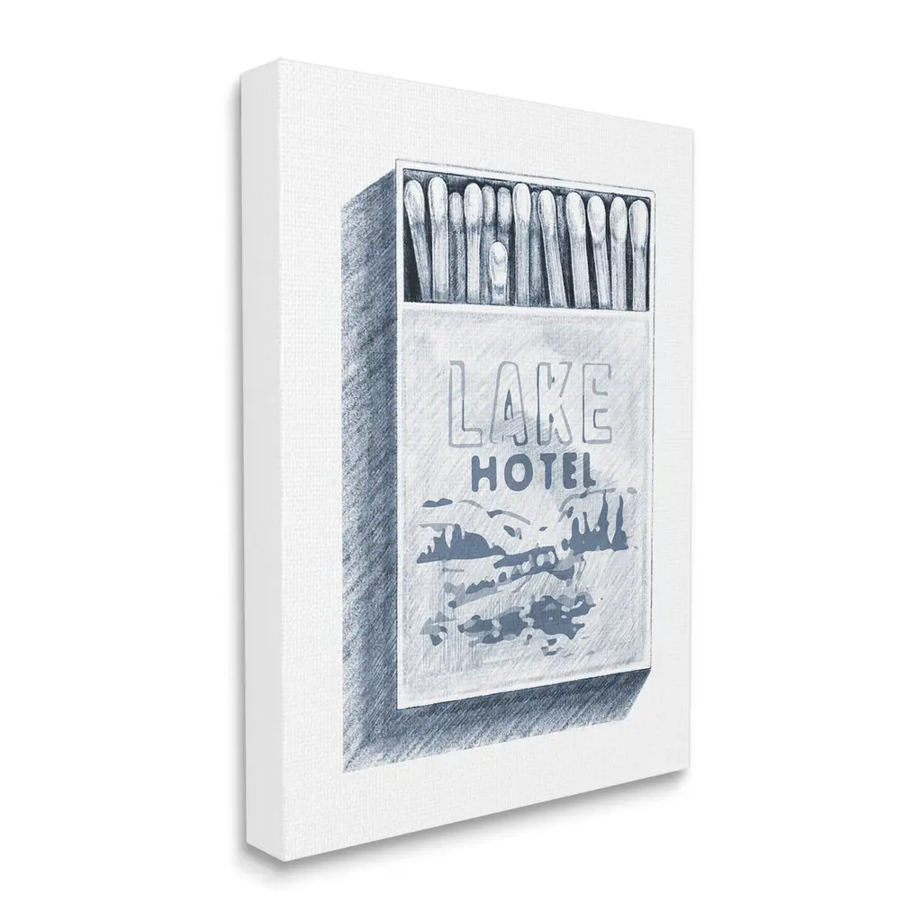 We create our stretched canvas to the highest standards. Using only the highest quality inks and canvas on Mimaki printers, we hand-cut and stretch each piece over a 1.5-inch thick wooden frame for hanging. As a result, the art comes ready to hang on the sturdy ledge with no installation required. Stupell Wall Art is made in the USA.Features: Dimensions: 16 x 1.5 x 20 InchesStretched Canvas Sizes Include Standard: 16 x 1.5 x 20 Large: 20 x 1.5 x 30 X-Large: 30 x 1.5 x 40 Oversized: 36 x 1.5 x 48Wall Art is Ready to Hang - No Installation or Hardware Needed. For Easy Set Up Lean or Layer Artwork on Shelf or Against Wall.Our stretched canvas is created with the highest standards. We use only the highest quality inks and canvas on our in house Mimaki printers, and then hand cut and stretch each piece over a 1.5 inch thick wooden frame for hanging. Made In USA.Artwork Relates To: Drawing, Matchbook, Lake HotelDesign by Lil' Rue