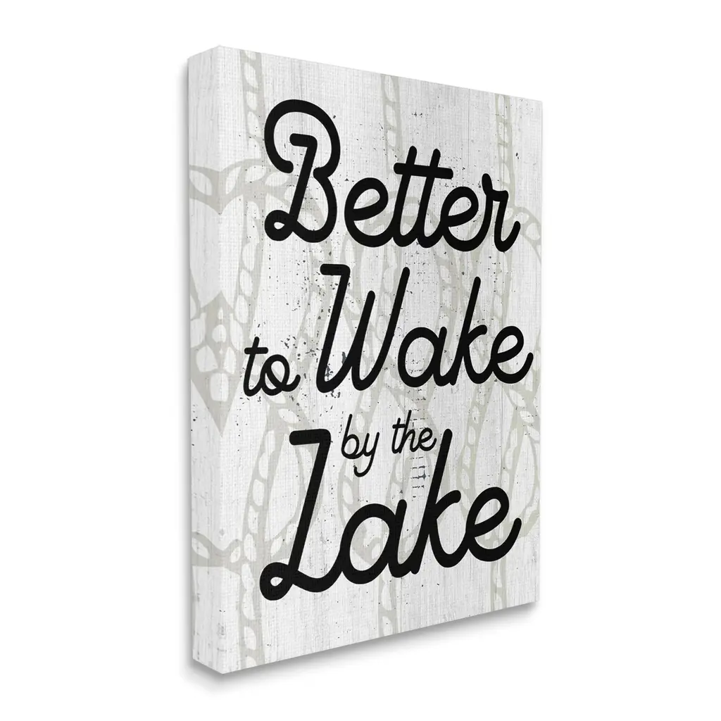 We create our stretched canvas to the highest standards. Using only the highest quality inks and canvas on Mimaki printers, we hand-cut and stretch each piece over a 1.5-inch thick wooden frame for hanging. As a result, the art comes ready to hang on the sturdy ledge with no installation required. Stupell Wall Art is made in the USA.Features: Dimensions: 16 x 1.5 x 20 InchesStretched Canvas Sizes Include Standard: 16 x 1.5 x 20 Large: 20 x 1.5 x 30 X-Large: 30 x 1.5 x 40 Oversized: 36 x 1.5 x 48Wall Art is Ready to Hang with Hardware Free Hanging. No installation required. For Easy Set Up Lean or Layer Artwork on Shelf or Against Wall.Our stretched canvas is created with the highest standards. We use only the highest quality inks and canvas on our in house Mimaki printers, and then hand cut and stretch each piece over a 1.5 inch thick wooden frame for hanging. Made In USA.Artwork Relates To: Phrase, Rope, Rustic, Phrase, Lake house, Better to Wake by the LakeDesign by Lil' Rue