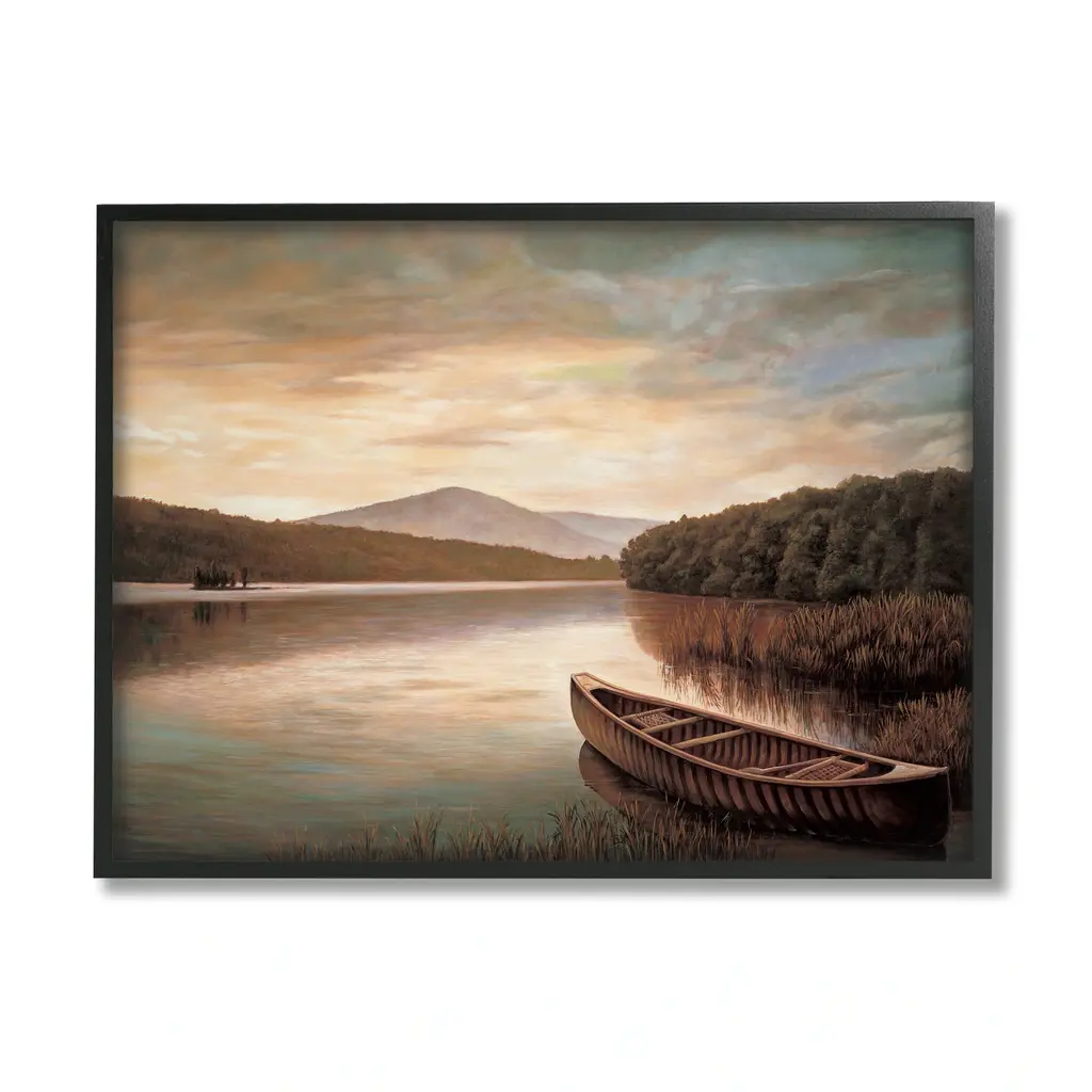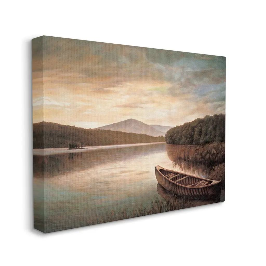 Stupell Lakeside Canoe Cloudy Sky Mountain Forest Landscape Canvas Wall Art - Brown - 20 X 16