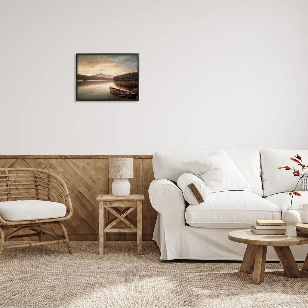 Stupell Lakeside Canoe Cloudy Sky Mountain Forest Landscape Framed Wall Art - Brown - 20 X 16 - Black
