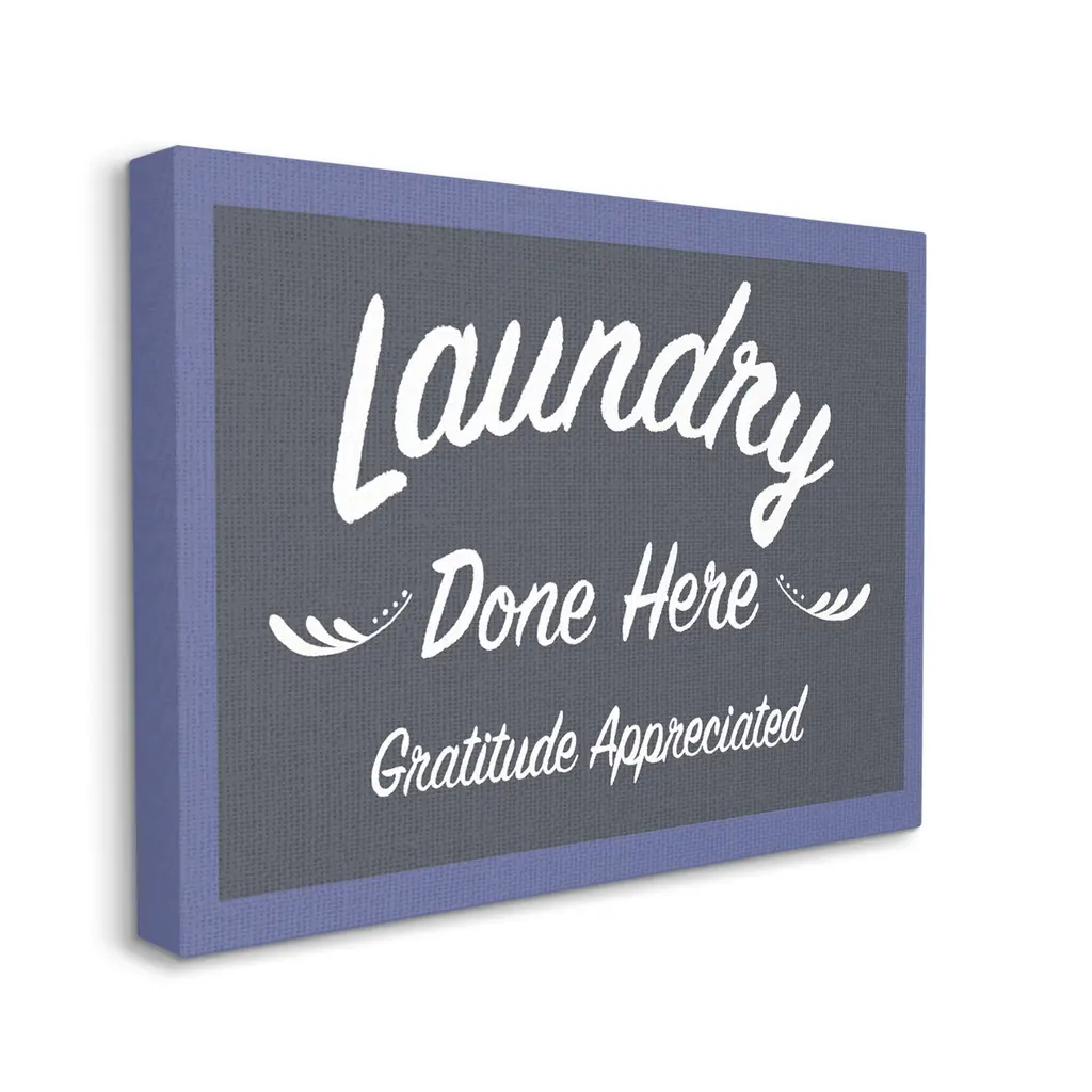 We create our stretched canvas to the highest standards. Using only the highest quality inks and canvas on Mimaki printers, we hand-cut and stretch each piece over a 1.5-inch thick wooden frame for hanging. As a result, the art comes ready to hang on the sturdy ledge with no installation required. Stupell Wall Art is made in the USA.Features: Dimensions: 20 x 1.5 x 16 InchesStretched Canvas Sizes Include Standard: 20 x 1.5 x 16 Large: 30 x 1.5 x 20 X-Large: 40 x 1.5 x 30 Oversized: 48 x 1.5 x 36Wall Art is Ready to Hang - No Installation or Hardware Needed. For Easy Set Up Lean or Layer Artwork on Shelf or Against Wall.Our stretched canvas is created with the highest standards. We use only the highest quality inks and canvas on our in house Mimaki printers, and then hand cut and stretch each piece over a 1.5 inch thick wooden frame for hanging. Made In USA.Artwork Relates To: Bathroom, Laundry, Sign, Laundry Done Here Gratitude AppreciatedDesign by Darlene Seale