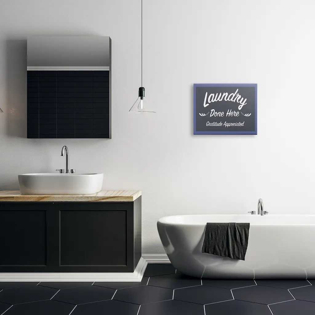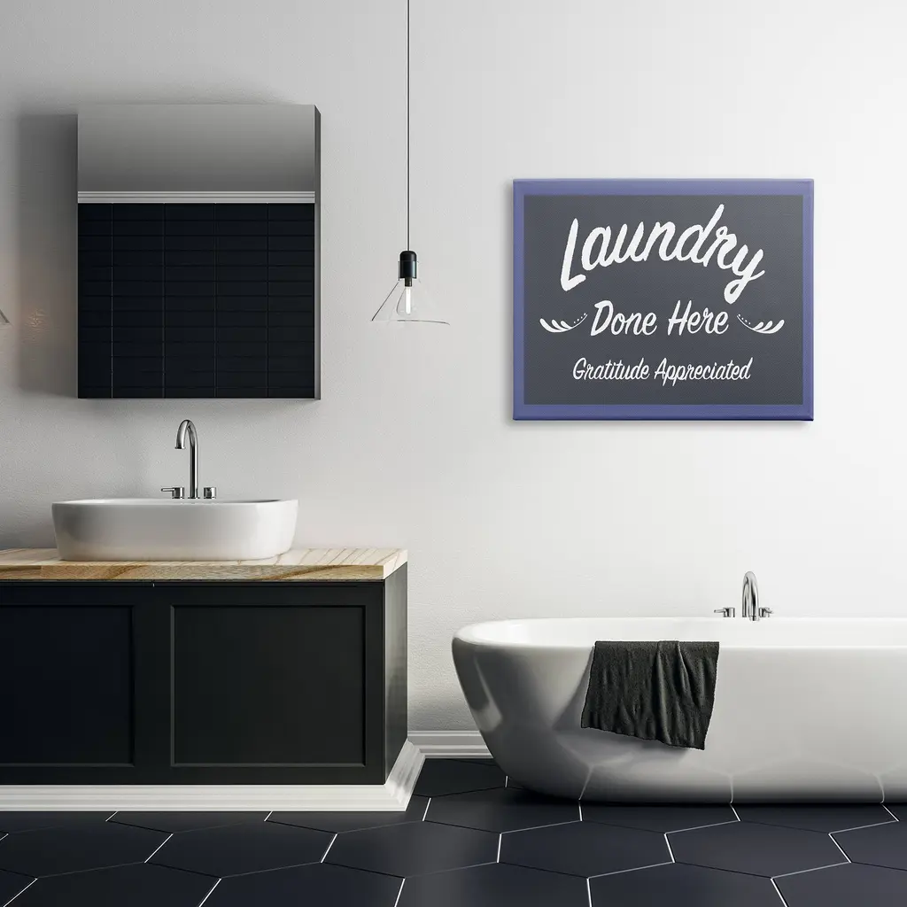 We create our stretched canvas to the highest standards. Using only the highest quality inks and canvas on Mimaki printers, we hand-cut and stretch each piece over a 1.5-inch thick wooden frame for hanging. As a result, the art comes ready to hang on the sturdy ledge with no installation required. Stupell Wall Art is made in the USA.Features: Dimensions: 20 x 1.5 x 16 InchesStretched Canvas Sizes Include Standard: 20 x 1.5 x 16 Large: 30 x 1.5 x 20 X-Large: 40 x 1.5 x 30 Oversized: 48 x 1.5 x 36Wall Art is Ready to Hang - No Installation or Hardware Needed. For Easy Set Up Lean or Layer Artwork on Shelf or Against Wall.Our stretched canvas is created with the highest standards. We use only the highest quality inks and canvas on our in house Mimaki printers, and then hand cut and stretch each piece over a 1.5 inch thick wooden frame for hanging. Made In USA.Artwork Relates To: Bathroom, Laundry, Sign, Laundry Done Here Gratitude AppreciatedDesign by Darlene Seale