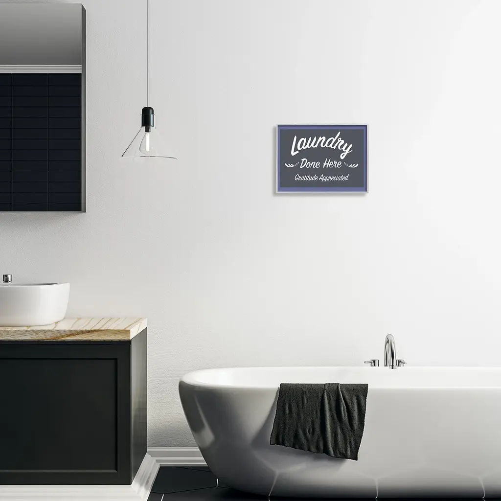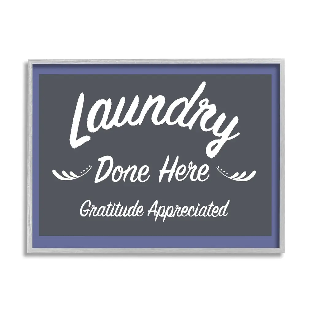 Add dimension to any room with our textured Framed Giclee Artwork. Our framed artwork is securely mounted into a 1.5-inch thick wood grain frame and ready to hang. Frames are available in three alluring styles: black, gray farmhouse and white. In addition, you should check out our oversized options if you want a statement piece. Stupell Wall Art is made in the USA.Features: Dimensions: 14 x 1.5 x 11 FramedFramed Giclee Sizes Include Standard: 14 x 1.5 x 11 Large: 20 x 1.5 x 16 Oversized: 30 x 1.5 x 24Wall Art is Ready to Hang - No Installation or Hardware Needed. For Easy Set Up Lean or Layer Artwork on Shelf or Against Wall.Our giclée prints are carefully mounted on a durable MDF backing, and then perfectly finished in a 1.5 inch thick woodgrain frame. Mounted frame colors include black, gray farmhouse and white. Made In USA.Artwork Relates To: Bathroom, Laundry, Sign, Laundry Done Here Gratitude AppreciatedDesign by Darlene Seale