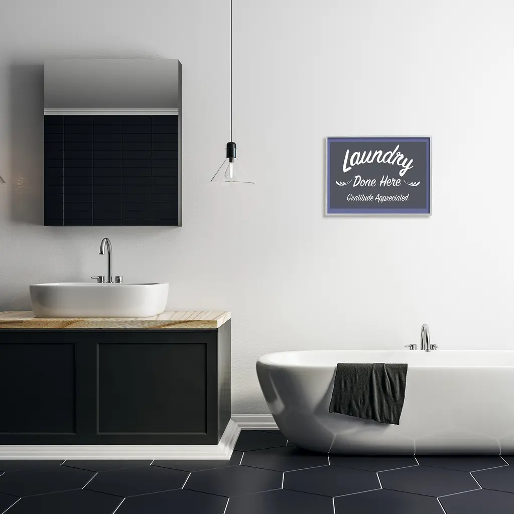 Add dimension to any room with our textured Framed Giclee Artwork. Our framed artwork is securely mounted into a 1.5-inch thick wood grain frame and ready to hang. Frames are available in three alluring styles: black, gray farmhouse and white. In addition, you should check out our oversized options if you want a statement piece. Stupell Wall Art is made in the USA.Features: Dimensions: 14 x 1.5 x 11 FramedFramed Giclee Sizes Include Standard: 14 x 1.5 x 11 Large: 20 x 1.5 x 16 Oversized: 30 x 1.5 x 24Wall Art is Ready to Hang - No Installation or Hardware Needed. For Easy Set Up Lean or Layer Artwork on Shelf or Against Wall.Our giclée prints are carefully mounted on a durable MDF backing, and then perfectly finished in a 1.5 inch thick woodgrain frame. Mounted frame colors include black, gray farmhouse and white. Made In USA.Artwork Relates To: Bathroom, Laundry, Sign, Laundry Done Here Gratitude AppreciatedDesign by Darlene Seale