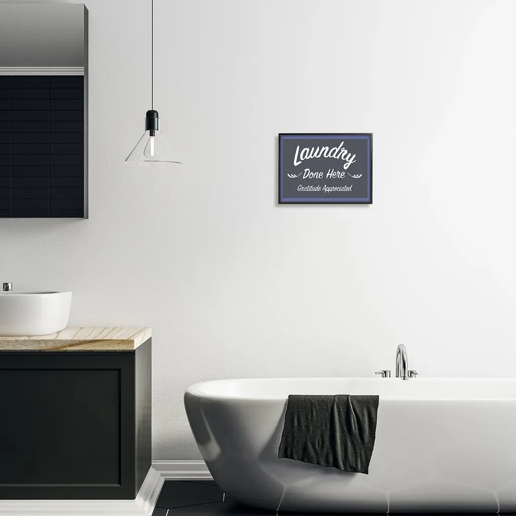 Add dimension to any room with our textured Framed Giclee Artwork. Our framed artwork is securely mounted into a 1.5-inch thick wood grain frame and ready to hang. Frames are available in three alluring styles: black, gray farmhouse and white. In addition, you should check out our oversized options if you want a statement piece. Stupell Wall Art is made in the USA.Features: Dimensions: 14 x 1.5 x 11 FramedFramed Giclee Sizes Include Standard: 14 x 1.5 x 11 Large: 20 x 1.5 x 16 Oversized: 30 x 1.5 x 24Wall Art is Ready to Hang - No Installation or Hardware Needed. For Easy Set Up Lean or Layer Artwork on Shelf or Against Wall.Our giclée prints are carefully mounted on a durable MDF backing, and then perfectly finished in a 1.5 inch thick woodgrain frame. Mounted frame colors include black, gray farmhouse and white. Made In USA.Artwork Relates To: Bathroom, Laundry, Sign, Laundry Done Here Gratitude AppreciatedDesign by Darlene Seale