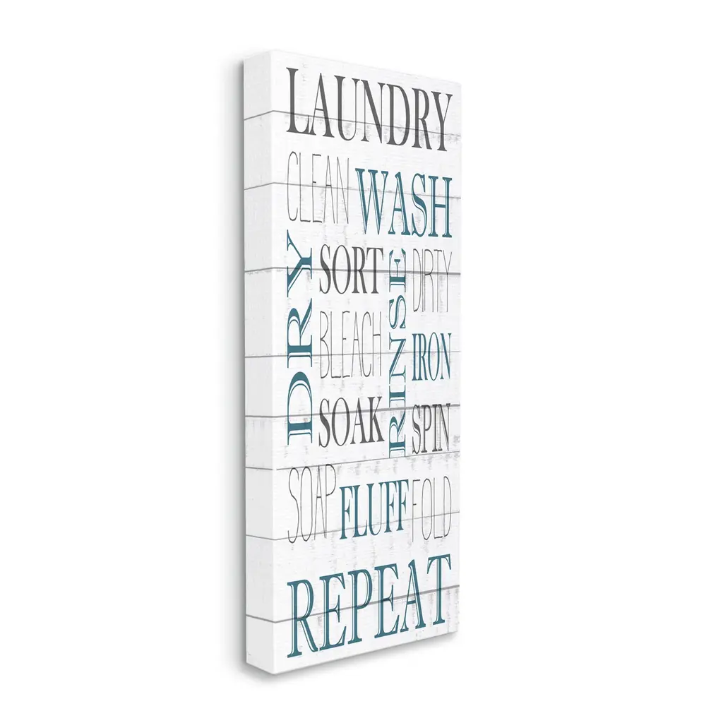 Proudly made in the USA, Our stretched canvas is created with the highest standards. We use only the highest quality inks and canvas on our in house Mimaki printers, and then hand cut and stretch each piece over a 1.5 inch thick wooden frame for hanging. The art comes ready to hang with no installation required.Features: Wall Art is Ready to Hang - No Installation or Hardware Needed. For Easy Set Up Lean or Layer Artwork on Shelf or Against Wall.Our stretched canvas is created with the highest standards. We use only the highest quality inks and canvas on our in house Mimaki printers, and then hand cut and stretch each piece over a 1.5 inch thick wooden frame for hanging. Made In USA.Artwork Relates To: LAUNDRY CLEAN WASH DRY SOAP FLUFF RINSE FOLD SORT DIRTY BLEACH IRON SOAK SPIN REPEAT, Sign, Design by Kim Allen