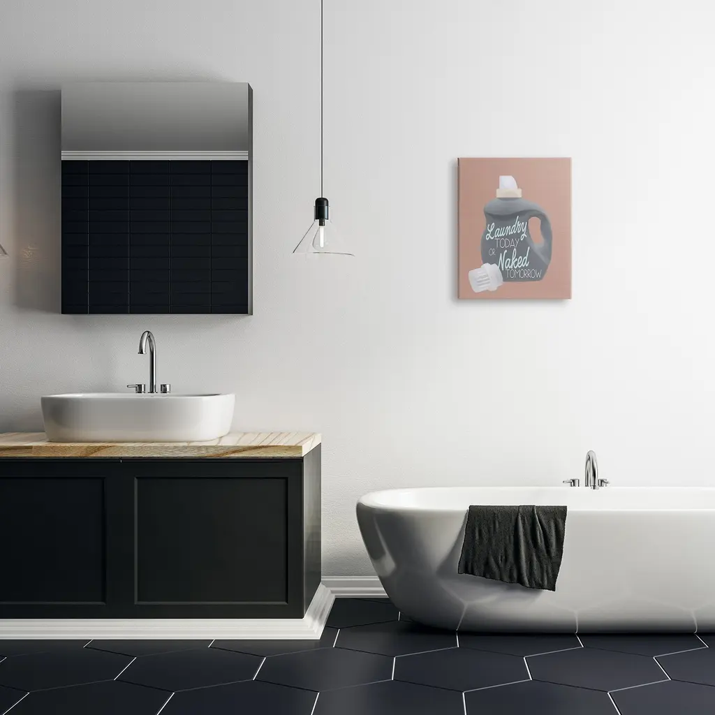 We create our stretched canvas to the highest standards. Using only the highest quality inks and canvas on Mimaki printers, we hand-cut and stretch each piece over a 1.5-inch thick wooden frame for hanging. As a result, the art comes ready to hang on the sturdy ledge with no installation required. Stupell Wall Art is made in the USA.Features: Dimensions: 16 x 1.5 x 20 InchesStretched Canvas Sizes Include Standard: 16 x 1.5 x 20 Large: 20 x 1.5 x 30 X-Large: 30 x 1.5 x 40 Oversized: 36 x 1.5 x 48Wall Art is Ready to Hang with Hardware Free Hanging. No installation required. For Easy Set Up Lean or Layer Artwork on Shelf or Against Wall.Our stretched canvas is created with the highest standards. We use only the highest quality inks and canvas on our in house Mimaki printers, and then hand cut and stretch each piece over a 1.5 inch thick wooden frame for hanging. Made In USA.Artwork Relates To: Phrase, Laundry, Funny, Laundry Today Or Naked TomorrowDesign by Elizabeth Medley